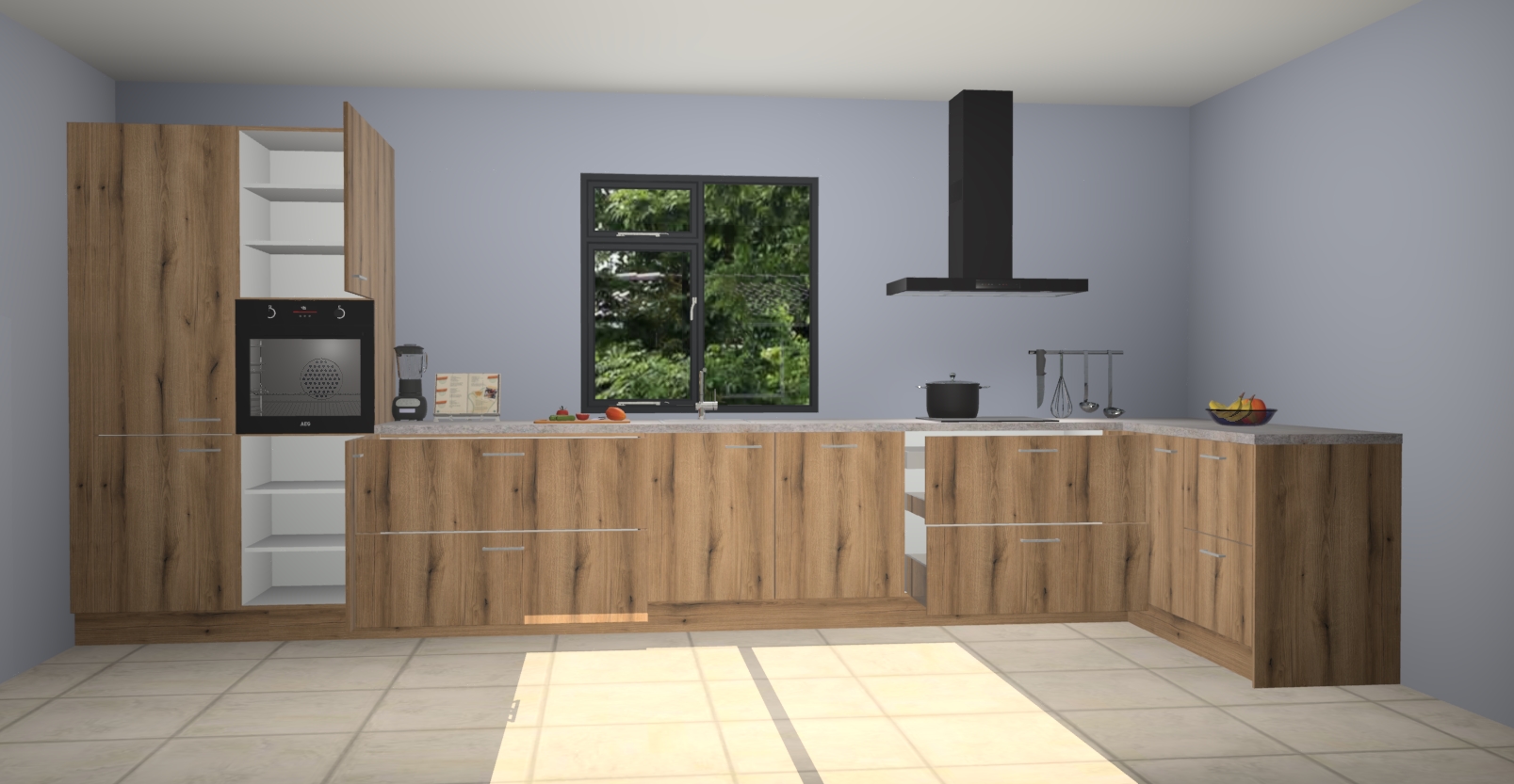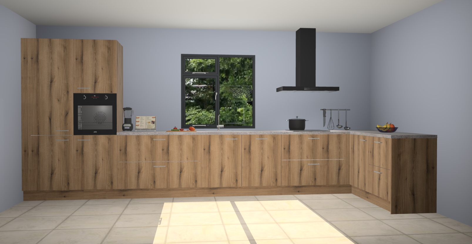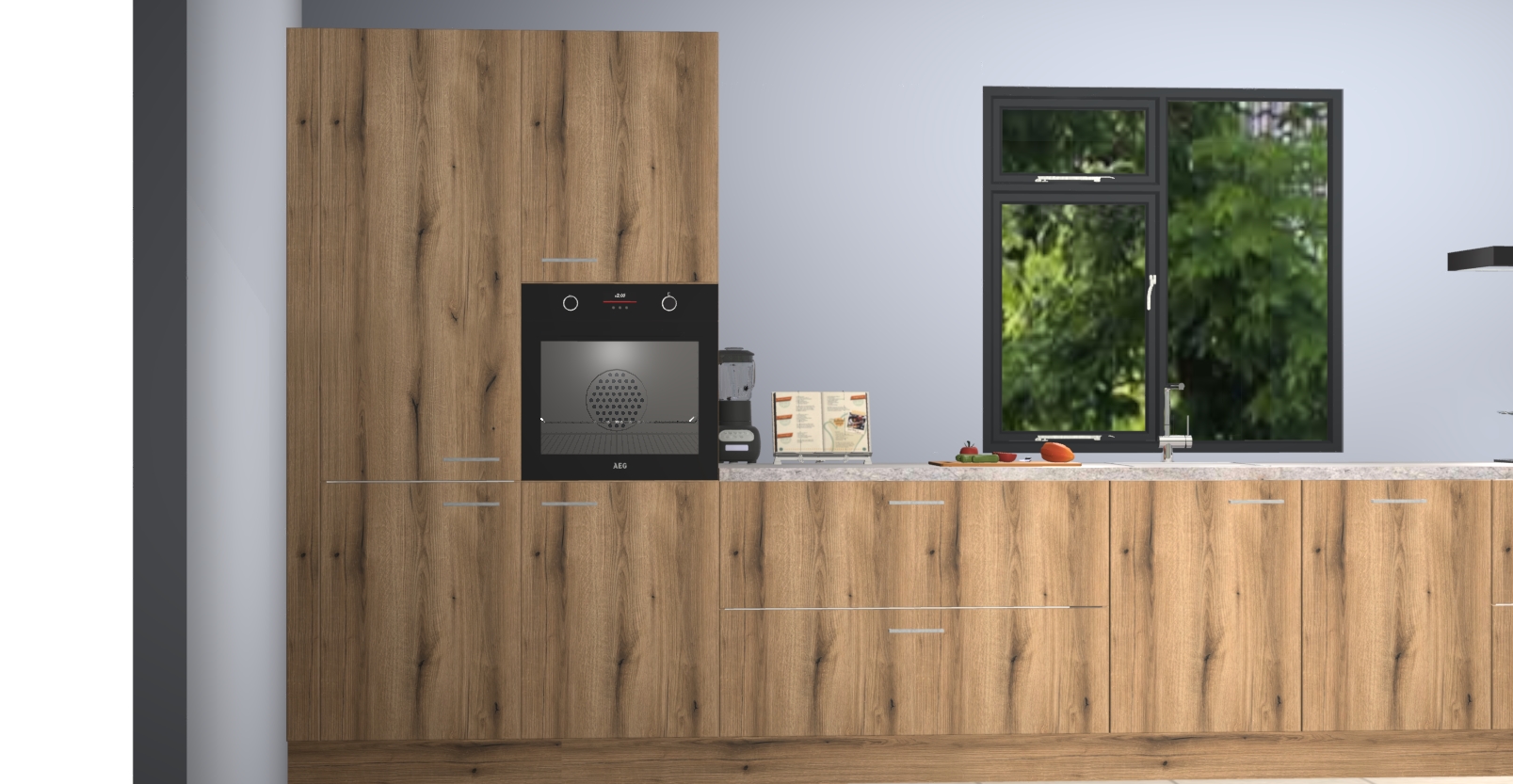 De Goud eiken keuken Lille wordt geleverd met vijf inbouwapparaten - een oven, inductiekookplaat, afzuigkap, vaatwasser en koelkast. Maar dat is nog niet alles! Na bestelling kunnen deze apparaten eenvoudig worden geüpgraded naar premium AEG-apparatuur. Bovendien is er zelfs de optie om de oven te vervangen door een combimagnetron of uw inductiekookplaat te vervangen door een kookplaat met geïntegreerde afzuiging.