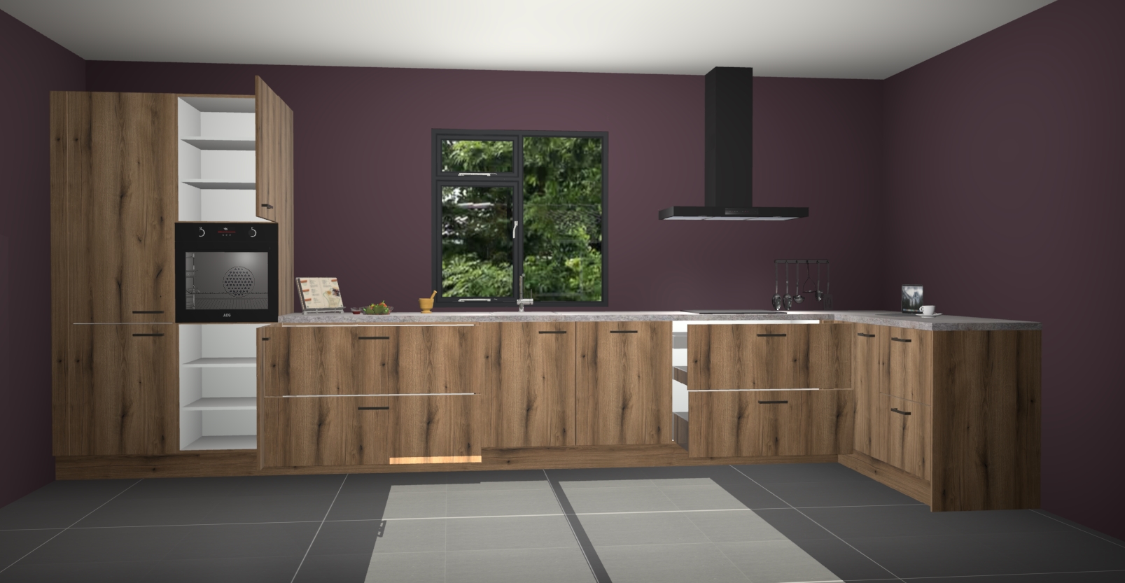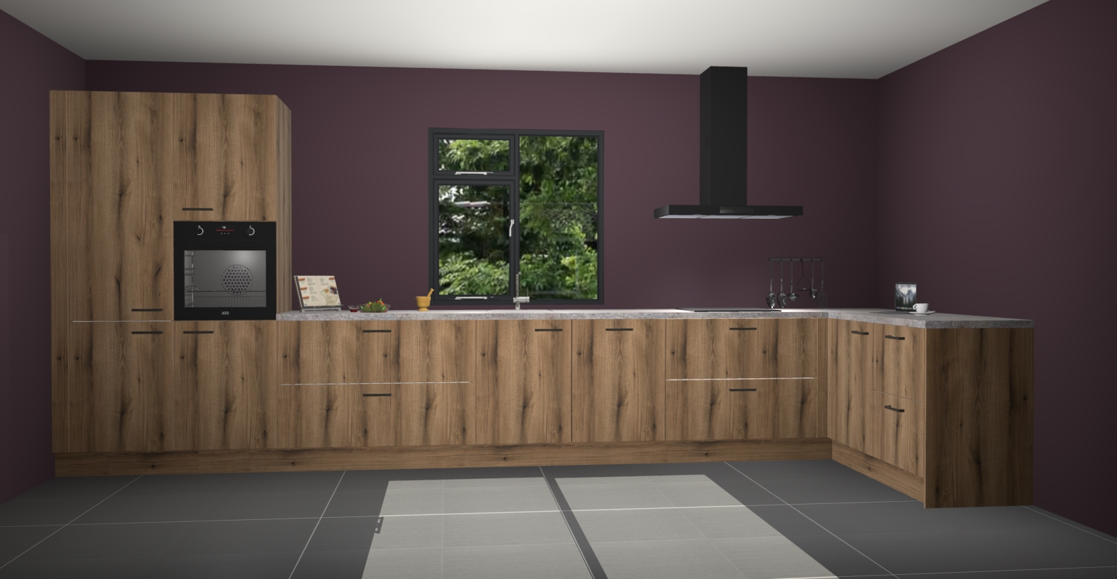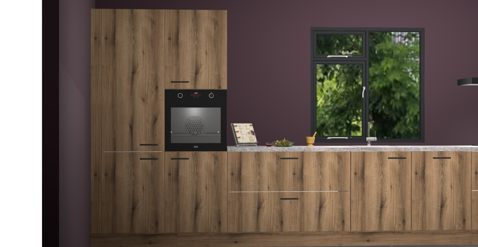 De Goud eiken keuken Lille wordt geleverd met vijf inbouwapparaten - een oven, inductiekookplaat, afzuigkap, vaatwasser en koelkast. Maar dat is nog niet alles! Na bestelling kunnen deze apparaten eenvoudig worden geüpgraded naar premium AEG-apparatuur. Bovendien is er zelfs de optie om de oven te vervangen door een combimagnetron of uw inductiekookplaat te vervangen door een kookplaat met geïntegreerde afzuiging.