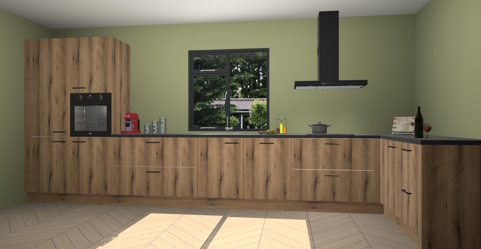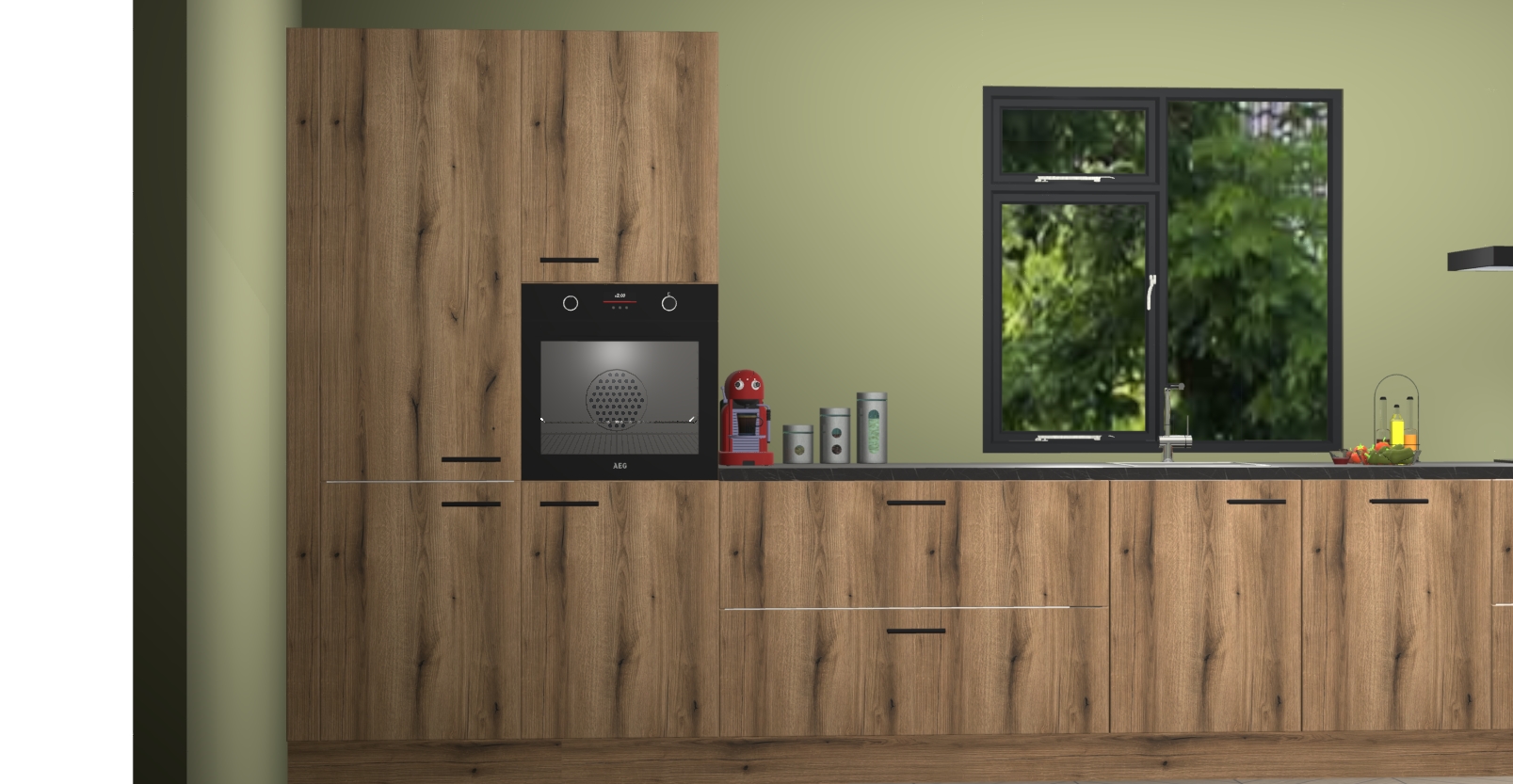 De Goud eiken keuken Lille wordt geleverd met vijf inbouwapparaten - een oven, inductiekookplaat, afzuigkap, vaatwasser en koelkast. Maar dat is nog niet alles! Na bestelling kunnen deze apparaten eenvoudig worden geüpgraded naar premium AEG-apparatuur. Bovendien is er zelfs de optie om de oven te vervangen door een combimagnetron of uw inductiekookplaat te vervangen door een kookplaat met geïntegreerde afzuiging.