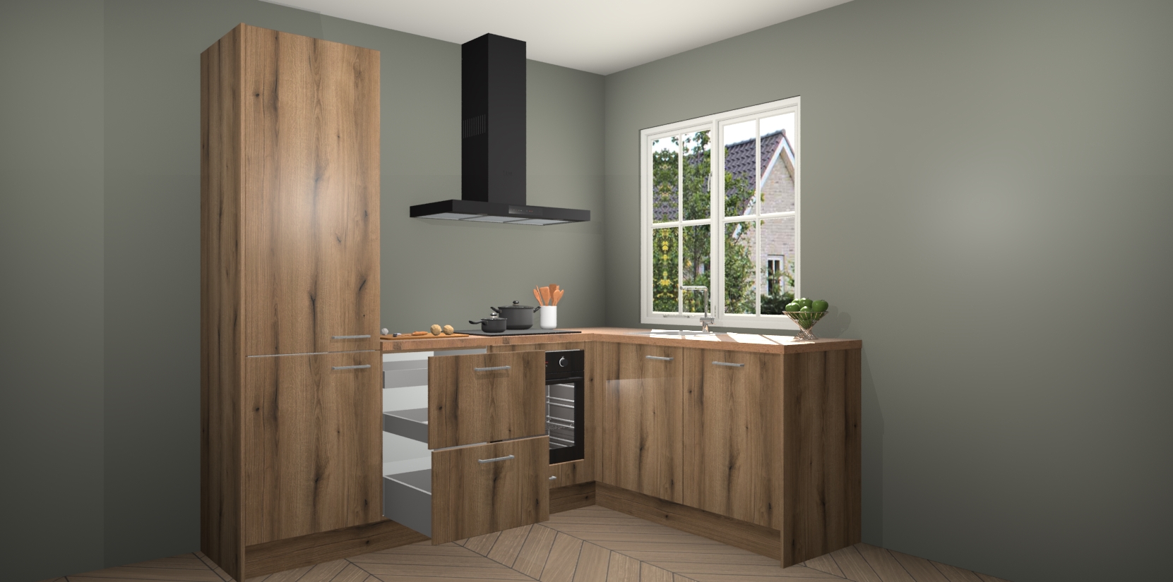 De Goud Eiken keuken Linz is de perfecte keuze voor uw nieuwe moderne en tijdloze keuken. Ga voor moderne en tijdloze elegantie in uw keuken. De prachtige hoekkeuken biedt een verfrissende kijk op de manier waarop we ons vertrouwde keukenontwerp kunnen aanpassen in een nieuwe stijl. Één blik om alles te zien: zo mooi dat het bijna magisch lijkt.