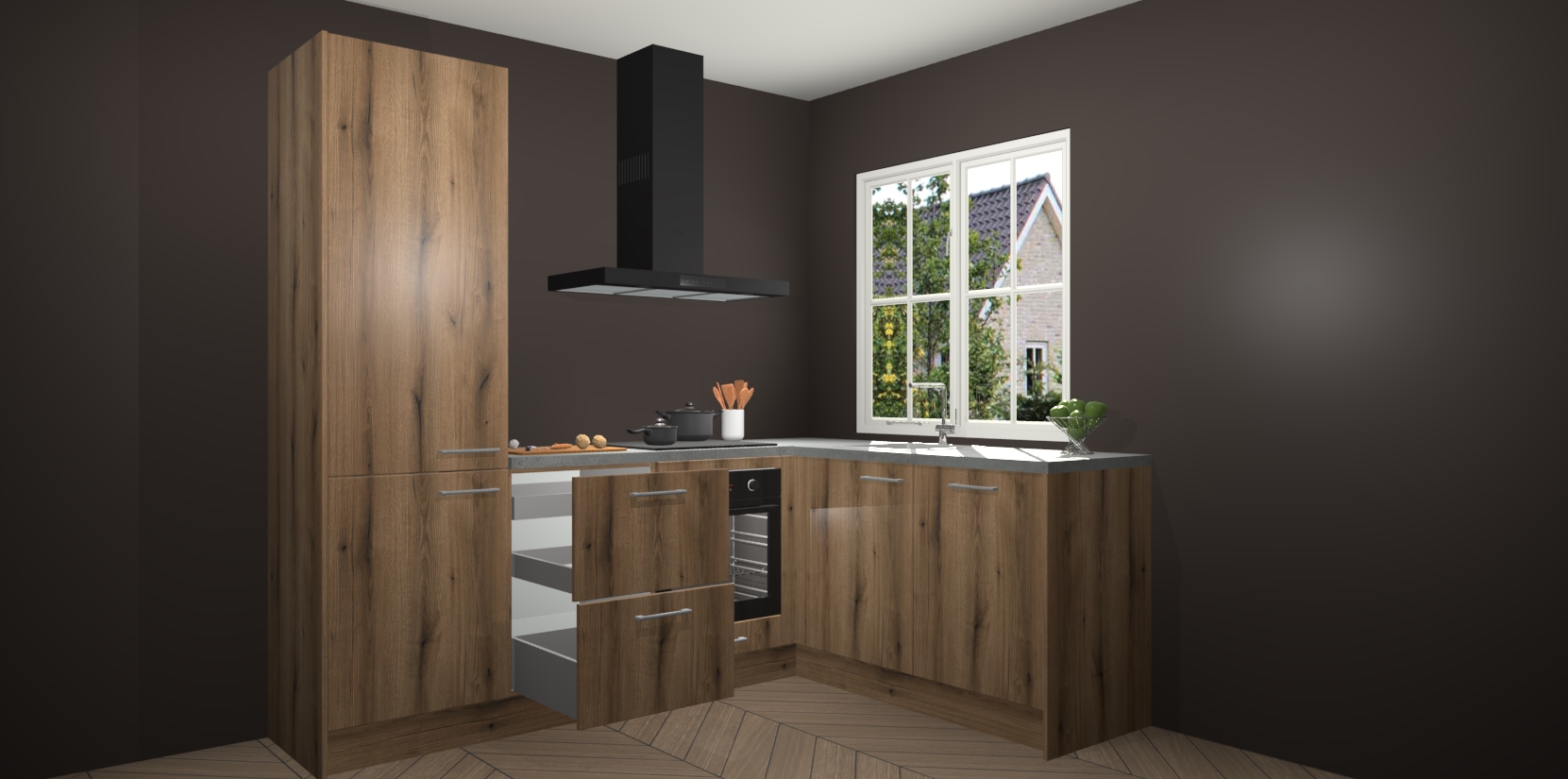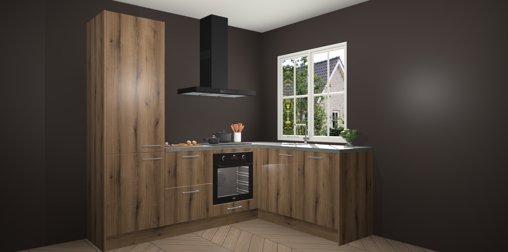 De Goud Eiken keuken Linz is de perfecte keuze voor uw nieuwe moderne en tijdloze keuken. Ga voor moderne en tijdloze elegantie in uw keuken. De prachtige hoekkeuken biedt een verfrissende kijk op de manier waarop we ons vertrouwde keukenontwerp kunnen aanpassen in een nieuwe stijl. Één blik om alles te zien: zo mooi dat het bijna magisch lijkt.