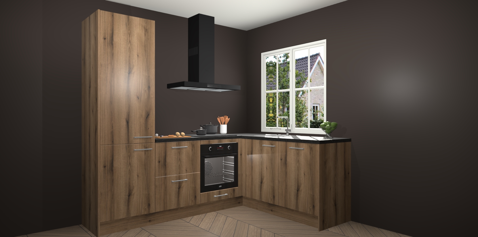 De Goud Eiken keuken Linz is de perfecte keuze voor uw nieuwe moderne en tijdloze keuken. Ga voor moderne en tijdloze elegantie in uw keuken. De prachtige hoekkeuken biedt een verfrissende kijk op de manier waarop we ons vertrouwde keukenontwerp kunnen aanpassen in een nieuwe stijl. Één blik om alles te zien: zo mooi dat het bijna magisch lijkt.
