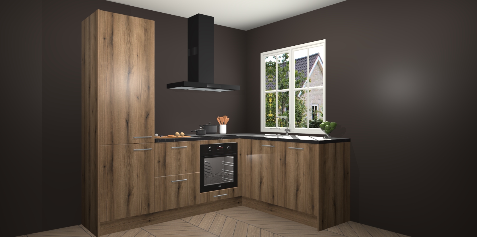 De Goud Eiken keuken Linz is de perfecte keuze voor uw nieuwe moderne en tijdloze keuken. Ga voor moderne en tijdloze elegantie in uw keuken. De prachtige hoekkeuken biedt een verfrissende kijk op de manier waarop we ons vertrouwde keukenontwerp kunnen aanpassen in een nieuwe stijl. Één blik om alles te zien: zo mooi dat het bijna magisch lijkt.