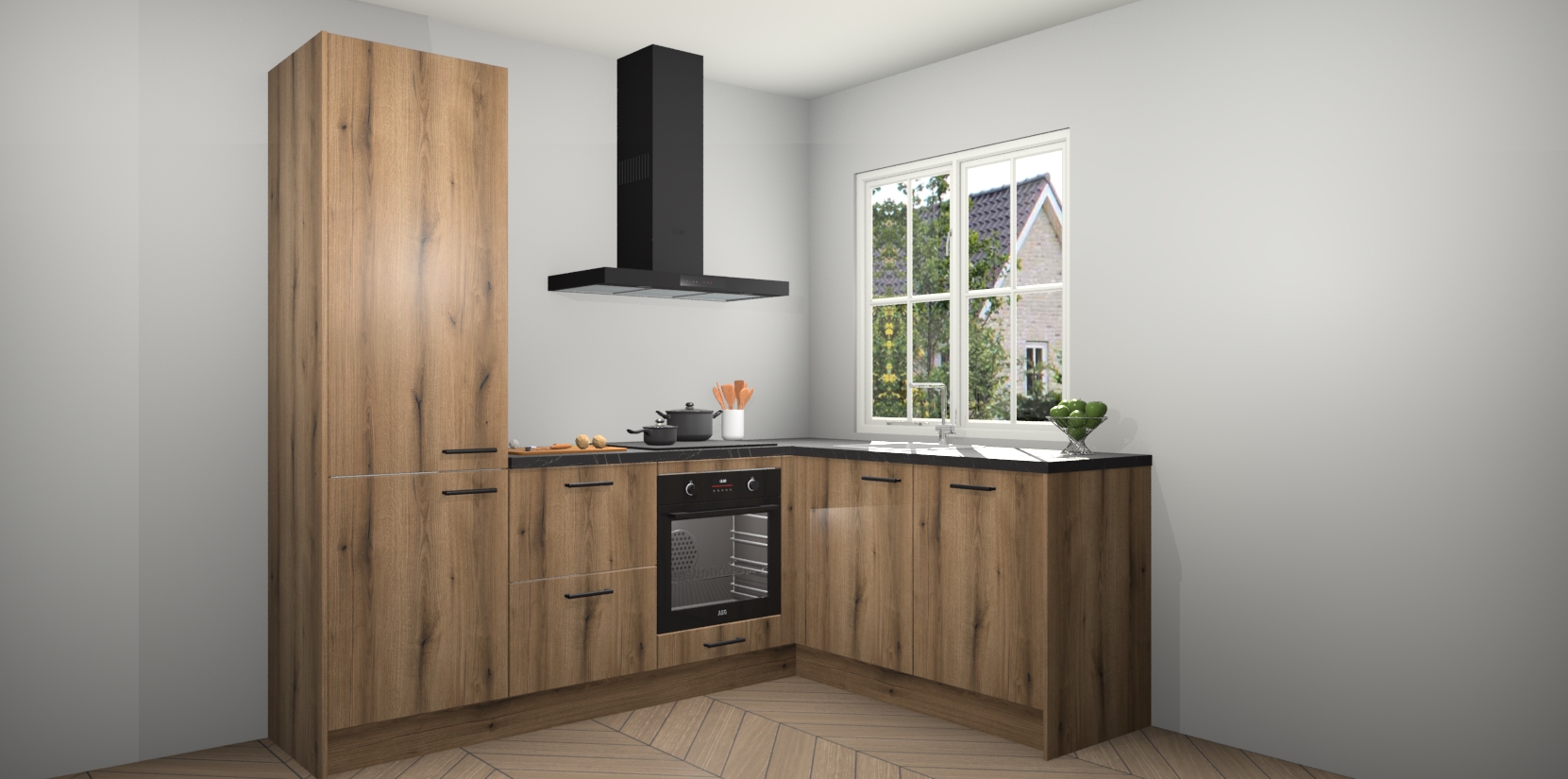 De Goud Eiken keuken Linz is de perfecte keuze voor uw nieuwe moderne en tijdloze keuken. Ga voor moderne en tijdloze elegantie in uw keuken. De prachtige hoekkeuken biedt een verfrissende kijk op de manier waarop we ons vertrouwde keukenontwerp kunnen aanpassen in een nieuwe stijl. Één blik om alles te zien: zo mooi dat het bijna magisch lijkt.