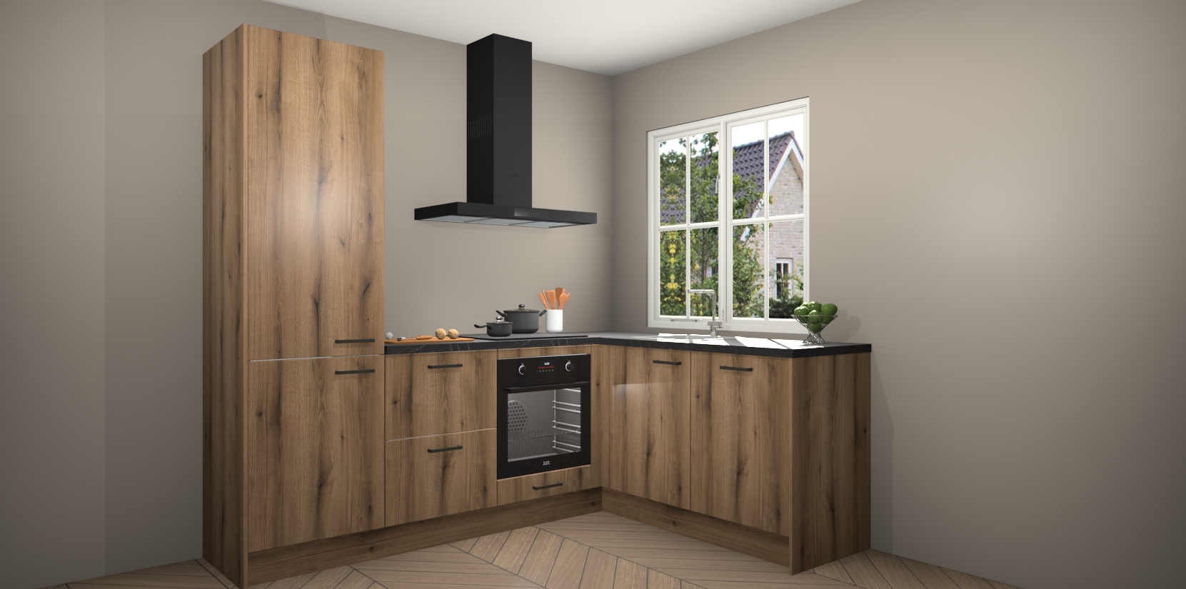 De Goud Eiken keuken Linz is de perfecte keuze voor uw nieuwe moderne en tijdloze keuken. Ga voor moderne en tijdloze elegantie in uw keuken. De prachtige hoekkeuken biedt een verfrissende kijk op de manier waarop we ons vertrouwde keukenontwerp kunnen aanpassen in een nieuwe stijl. Één blik om alles te zien: zo mooi dat het bijna magisch lijkt.