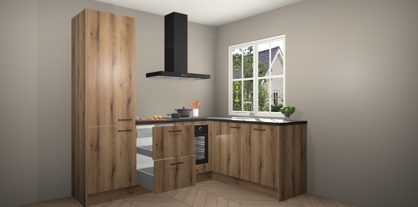 Het grote voordeel is dat uw Goud Eiken keuken Linz wordt geleverd met een beperkte levertijd van slechts 7 weken! Daarom moet u er snel bij zijn; want als u dit fantastische meubilair mist, kan niets anders dan spijt voelen. Ga direct aan de slag met uw droomkeuken door nu de Goud Eiken keuken Linz te bestellen - duizend woorden plaatjes in één woord: perfectie.