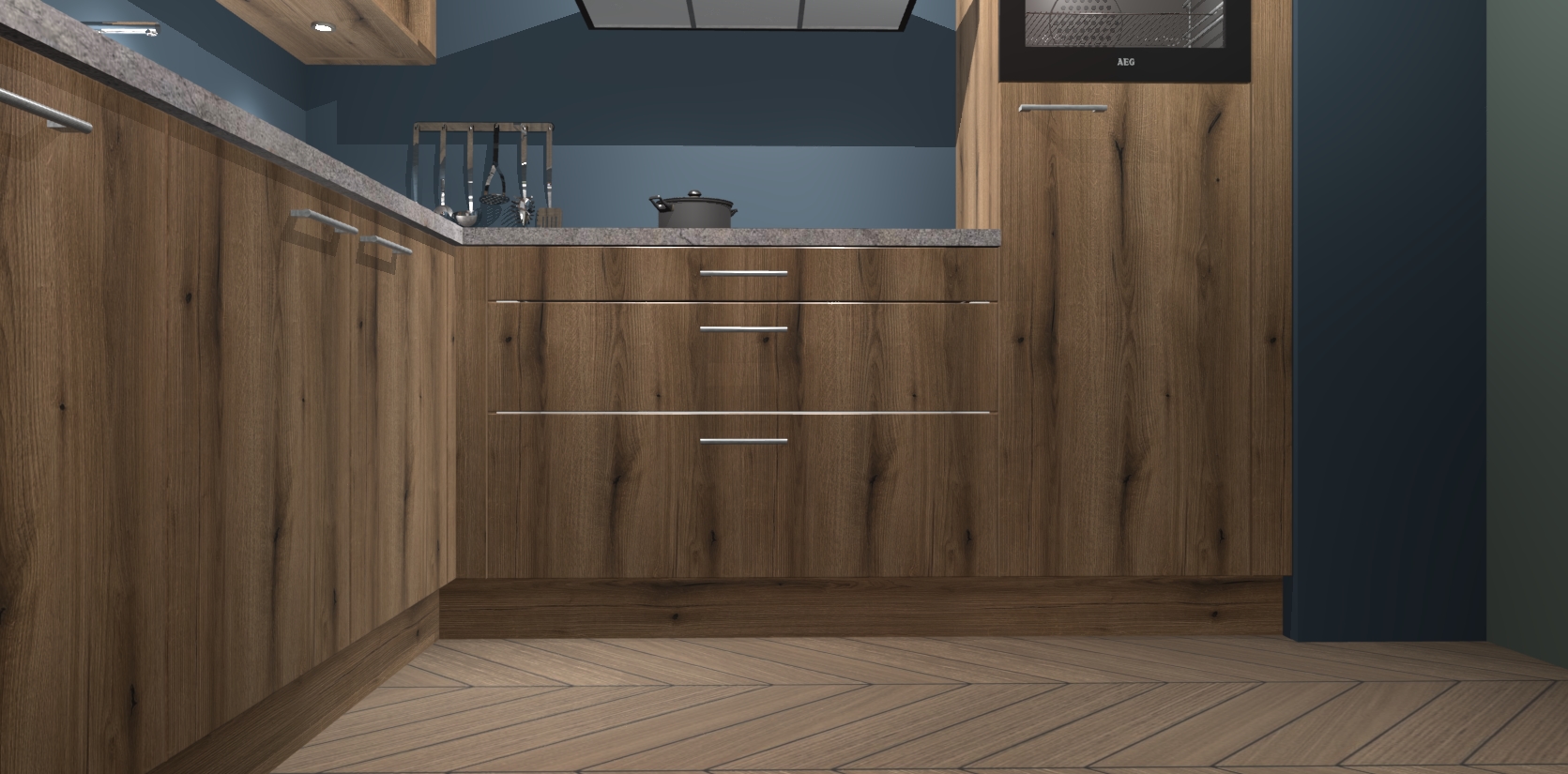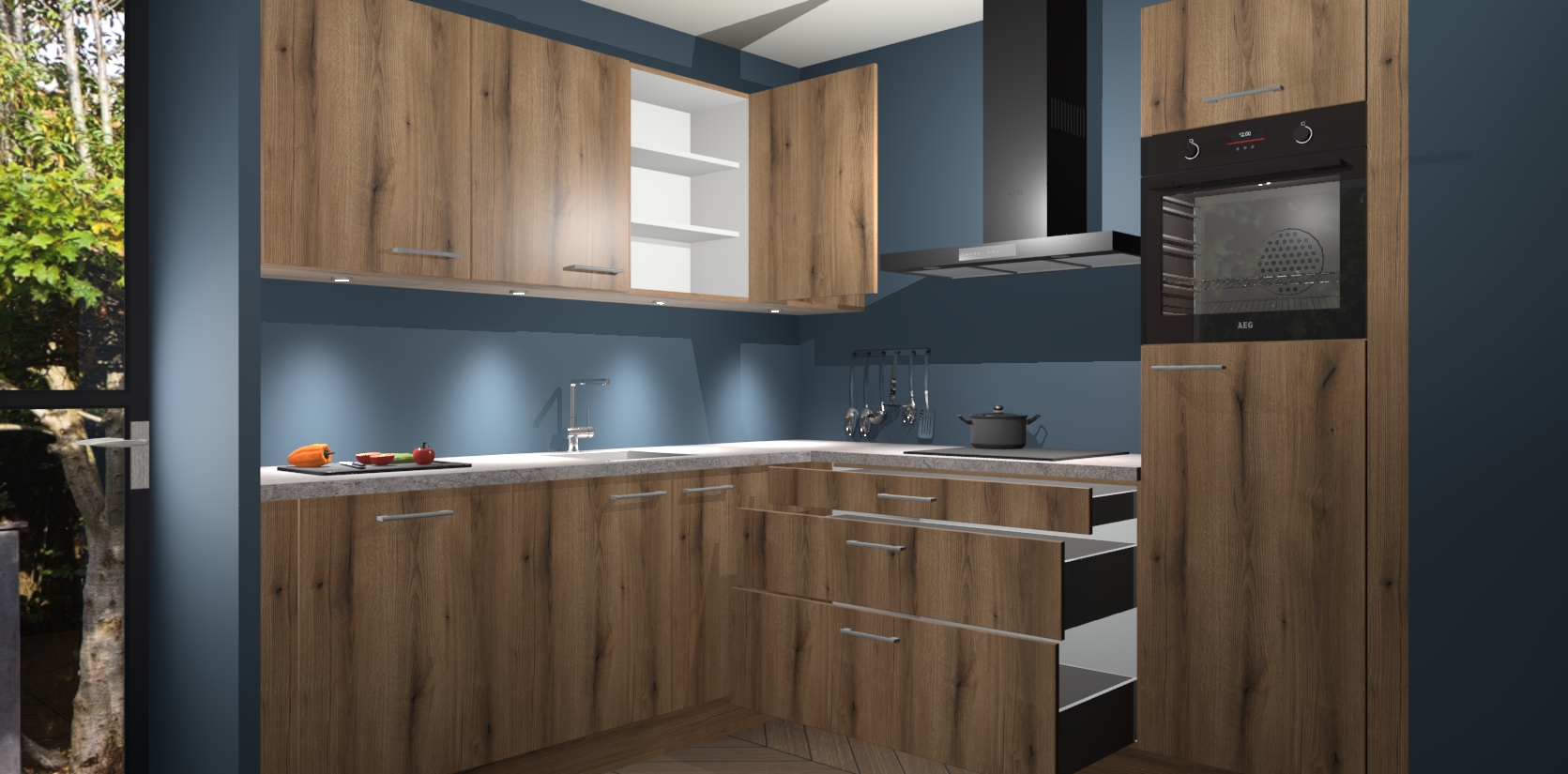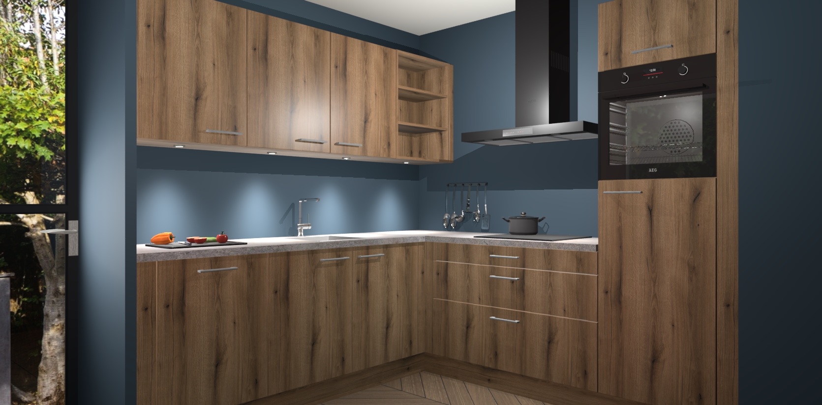Met een modern, tijdloos design en ruime opslagruimte, zult u zich in no-time thuis voelen in uw nieuwe keuken. Uw leven wordt eenvoudiger met de soft-close deuren die voor het ultieme stille comfort zorgen - geen geluid dat u stoort terwijl u kookt. Ook is de keuken voorzien van 5 ingebouwde apparaten: een oven, inductie kookplaat, afzuigkap, vaatwasser en koelkast. Deze kunnen gemakkelijk na bestelling worden bijgewerkt naar AEG - waardoor uw luxe ervaring compleet is.