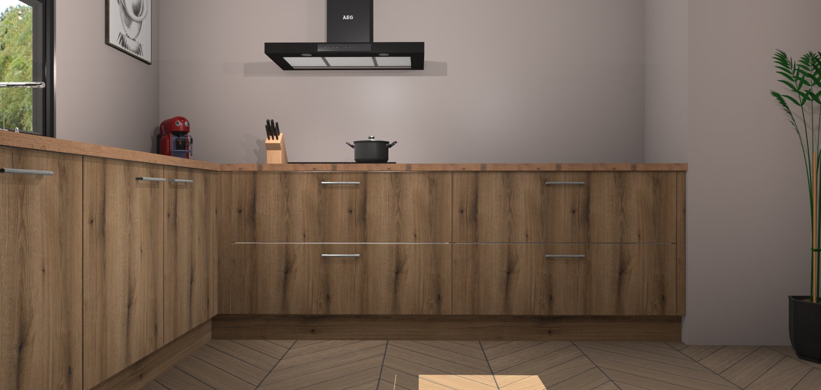 Welkom bij de goud eiken keuken Lublin. Deze prachtige keuken zal de komende jaren het middelpunt van de belangstelling in uw huis zijn. Uitgerust met vijf inbouwapparaten komt u nooit kookgereedschap tekort. Bovendien geeft de warme houtlook elke ruimte een uitnodigende en tijdloze uitstraling.