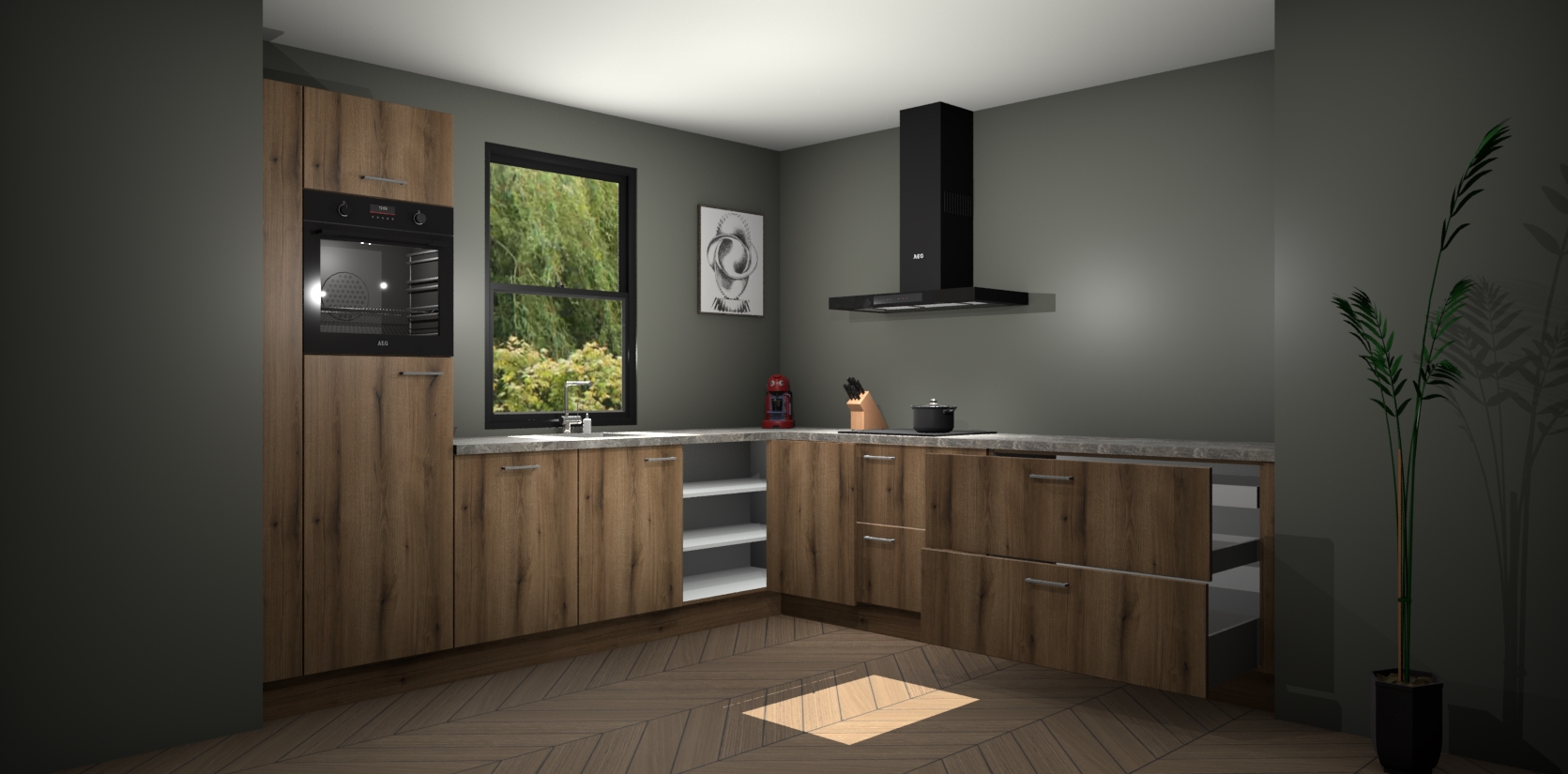 Welkom bij de goud eiken keuken Lublin. Deze prachtige keuken zal de komende jaren het middelpunt van de belangstelling in uw huis zijn. Uitgerust met vijf inbouwapparaten komt u nooit kookgereedschap tekort. Bovendien geeft de warme houtlook elke ruimte een uitnodigende en tijdloze uitstraling.