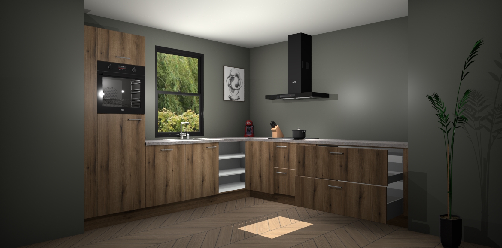 Welkom bij de goud eiken keuken Lublin. Deze prachtige keuken zal de komende jaren het middelpunt van de belangstelling in uw huis zijn. Uitgerust met vijf inbouwapparaten komt u nooit kookgereedschap tekort. Bovendien geeft de warme houtlook elke ruimte een uitnodigende en tijdloze uitstraling.