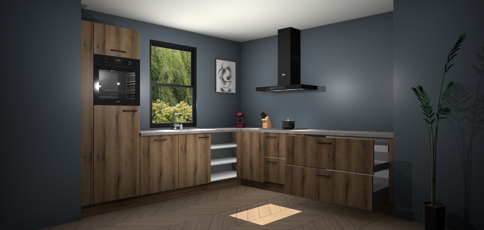 Welkom bij de goud eiken keuken Lublin. Deze prachtige keuken zal de komende jaren het middelpunt van de belangstelling in uw huis zijn. Uitgerust met vijf inbouwapparaten komt u nooit kookgereedschap tekort. Bovendien geeft de warme houtlook elke ruimte een uitnodigende en tijdloze uitstraling.
