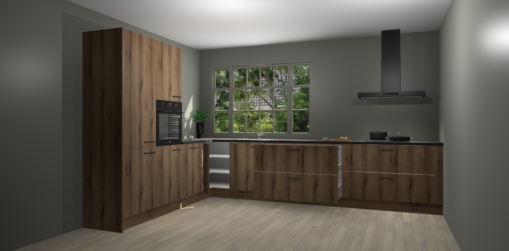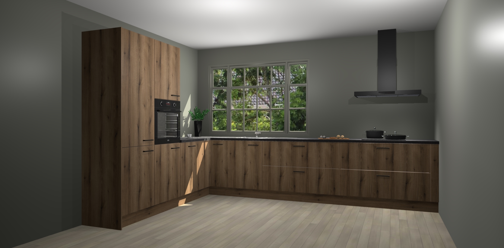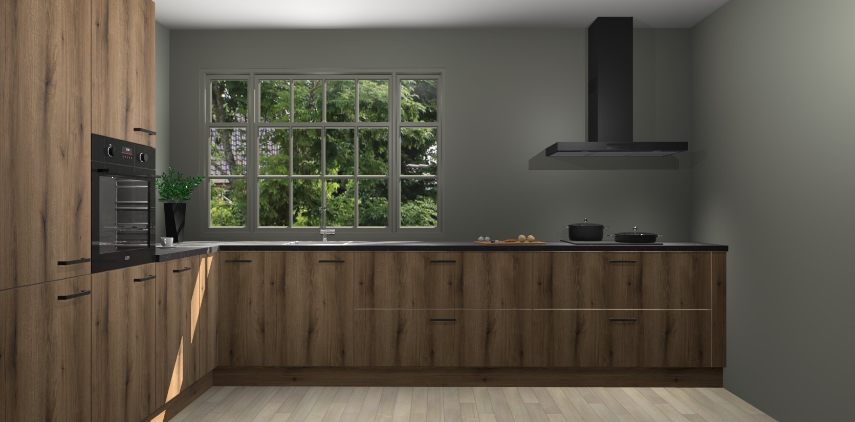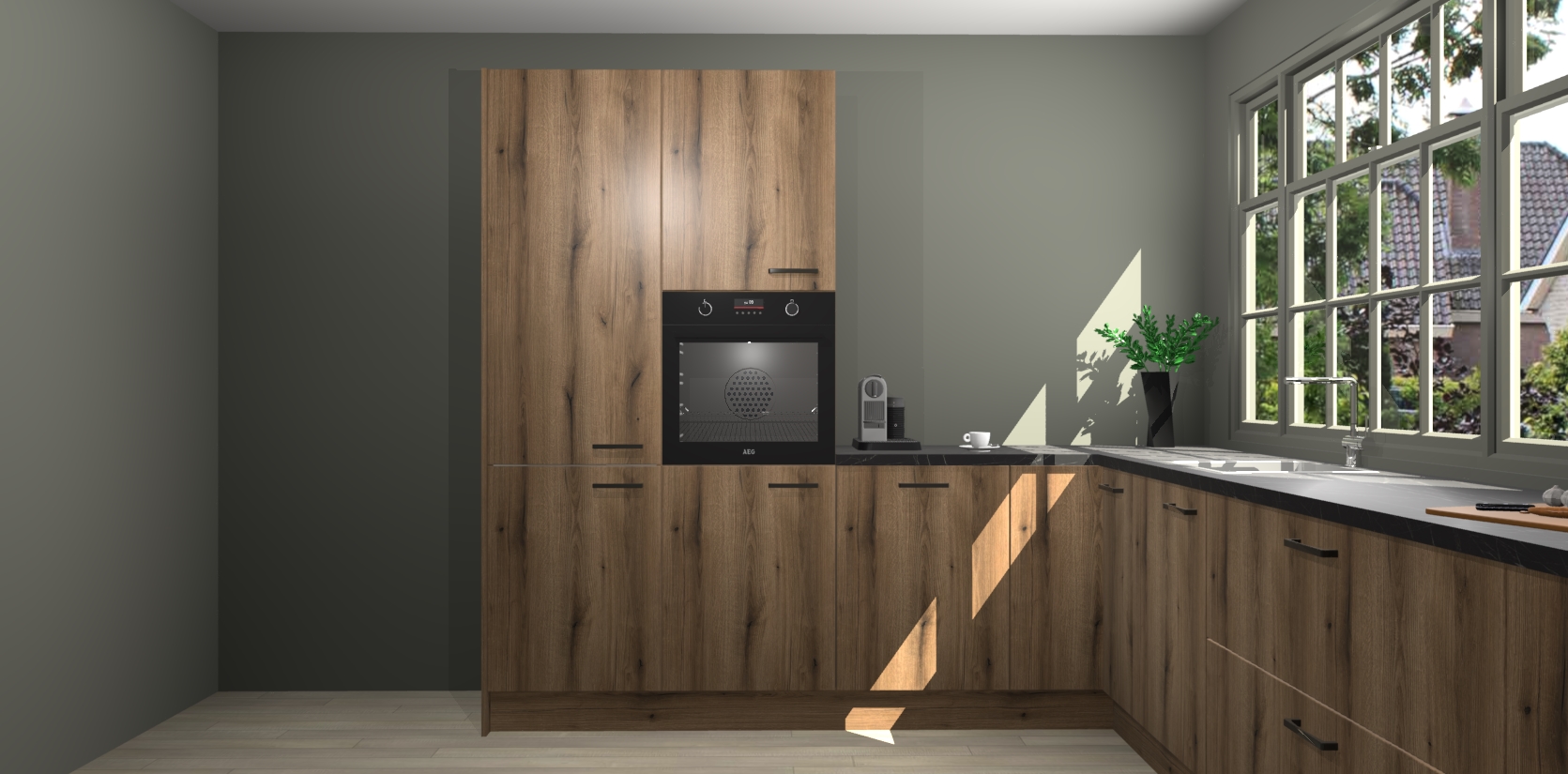 Kom dichtbij de perfecte keuken van uw dromen met de Goud Eiken keuken Malaga. Met een prachtige houtlook en eigentijds ontwerp, straalt deze keuken warmte en sfeer uit. Of u nu liefhebber bent van traditionele of moderne stijlen, er is genoeg ruimte om aan al uw behoeften te voldoen.