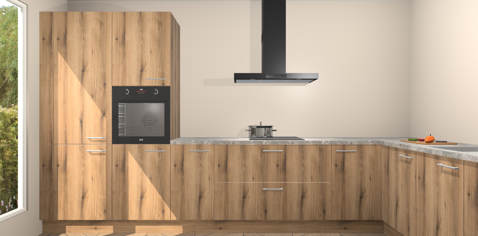 Met een modern, tijdloos design en ruime opslagruimte, zult u zich in no-time thuis voelen in uw nieuwe keuken. Uw leven wordt eenvoudiger met de soft-close deuren die voor het ultieme stille comfort zorgen - geen geluid dat u stoort terwijl u kookt. Ook is de keuken voorzien van 5 ingebouwde apparaten: een oven, inductie kookplaat, afzuigkap, vaatwasser en koelkast. Deze kunnen gemakkelijk na bestelling worden bijgewerkt naar AEG - waardoor uw luxe ervaring compleet is.