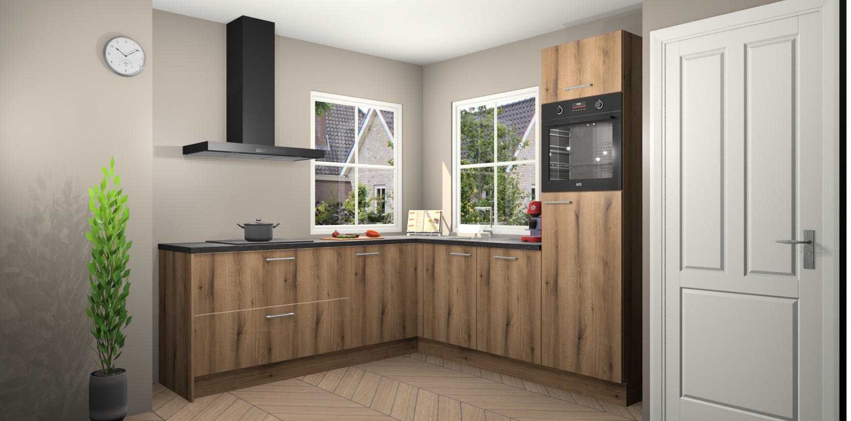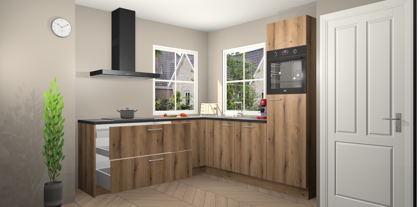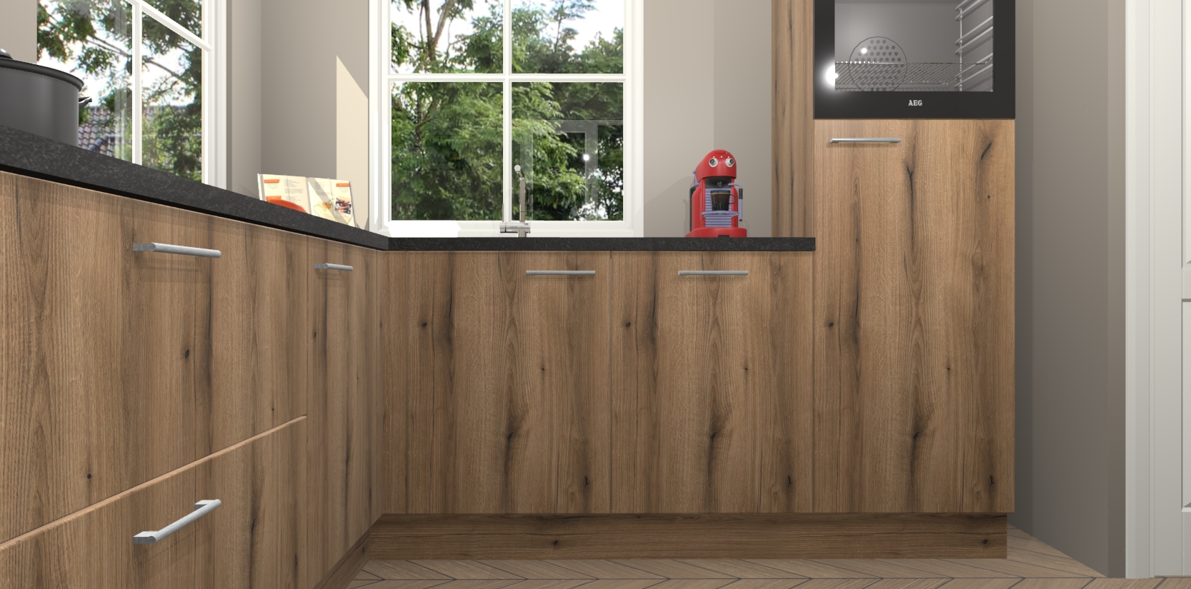 De Goud Eiken keuken Pai bevat vijf essentiële inbouwapparaten - een oven, inductiekookplaat, afzuigkap, vaatwasser en koelkast - zodat u er na levering meteen in kunt. Voor de slimme kopers die weten dat apparaten vaak het verschil kunnen maken tussen functioneel en luxueus, bieden we eenvoudige upgradeopties naar AEG, van oven naar combimagnetron na bestelling of naar een kookplaat met geïntrigeerde afzuiging. En met onze vaste lage prijs en snelle levering binnen zeven weken vanaf de orderbevestiging hoeft u zich geen zorgen te maken over verborgen kosten of lange levertijden die uw droomkeuken kunnen vertragen.