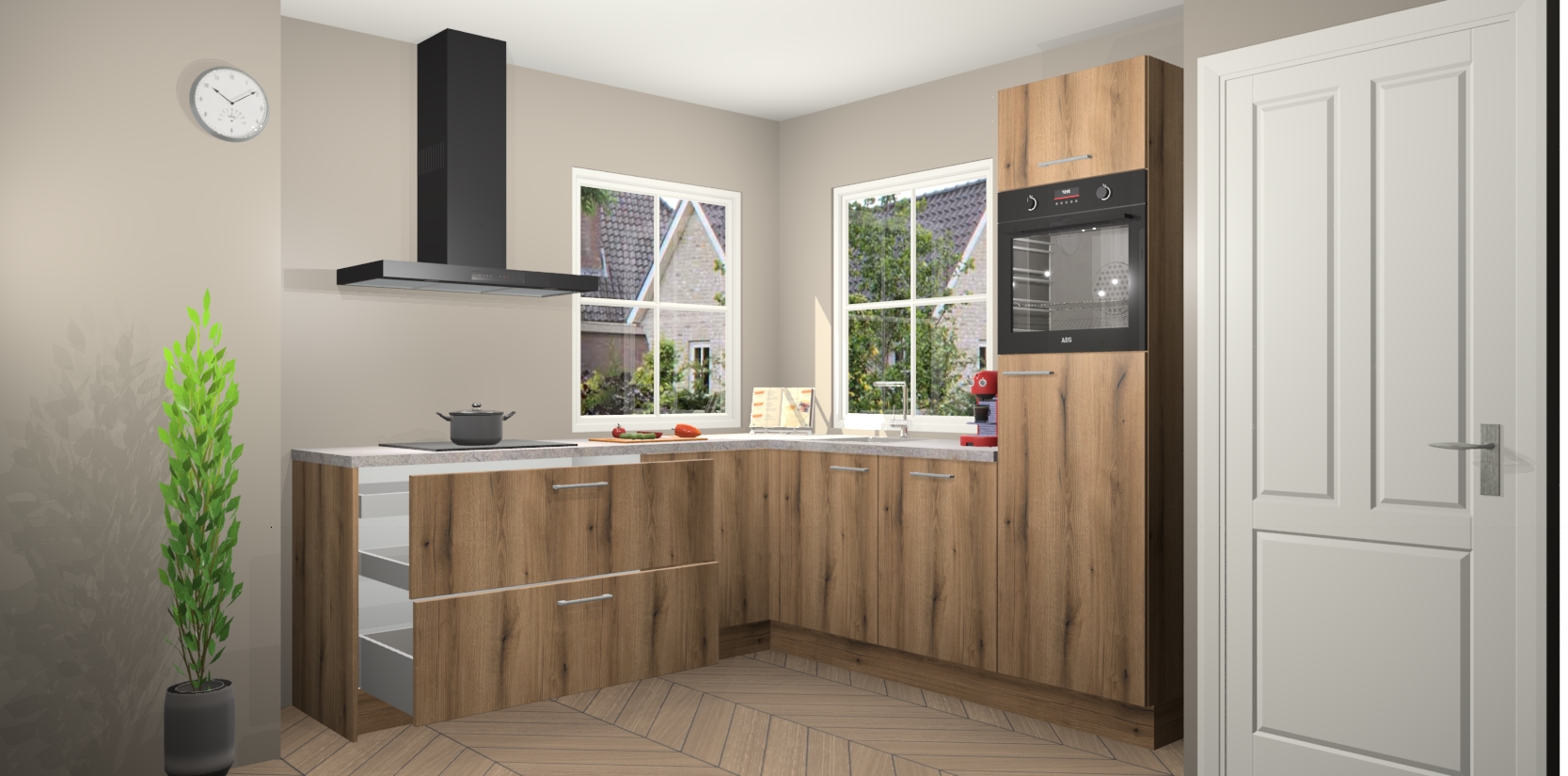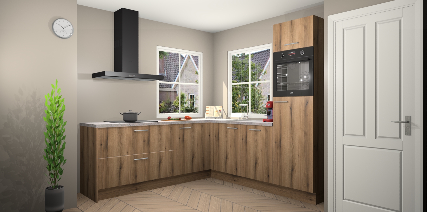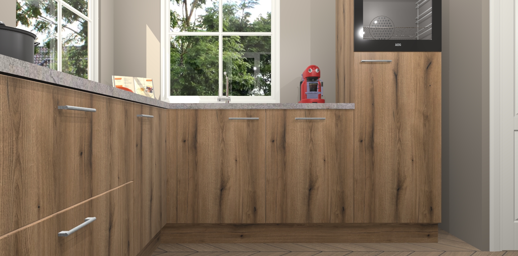 De Goud Eiken keuken Pai bevat vijf essentiële inbouwapparaten - een oven, inductiekookplaat, afzuigkap, vaatwasser en koelkast - zodat u er na levering meteen in kunt. Voor de slimme kopers die weten dat apparaten vaak het verschil kunnen maken tussen functioneel en luxueus, bieden we eenvoudige upgradeopties naar AEG, van oven naar combimagnetron na bestelling of naar een kookplaat met geïntrigeerde afzuiging. En met onze vaste lage prijs en snelle levering binnen zeven weken vanaf de orderbevestiging hoeft u zich geen zorgen te maken over verborgen kosten of lange levertijden die uw droomkeuken kunnen vertragen.