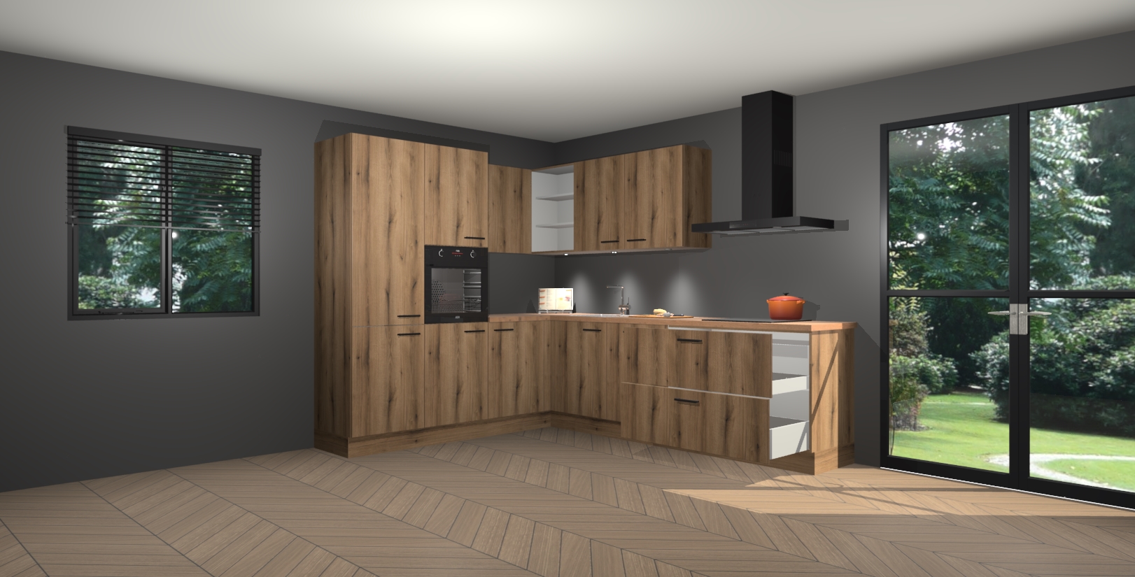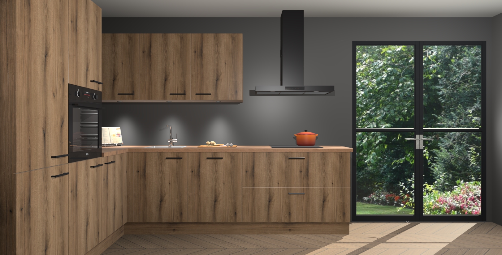 Maak kennis met de goud eiken keuken Parla - de perfecte aanvulling voor uw moderne keuken! Ervaar tijdloos design, elegantie en een chique uitstraling met onze zwarte handgrepen, soft-close deuren en veel opbergruimte. Dit alles wordt aangeboden tegen een vaste lage prijs voor ongeëvenaarde Duitse keukenkwaliteit!