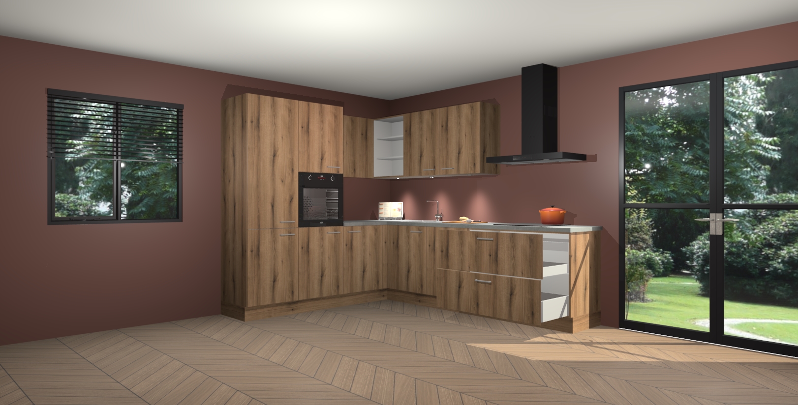 Maak kennis met de goud eiken keuken Parla - de perfecte aanvulling voor uw moderne keuken! Ervaar tijdloos design, elegantie en een chique uitstraling met onze zwarte handgrepen, soft-close deuren en veel opbergruimte. Dit alles wordt aangeboden tegen een vaste lage prijs voor ongeëvenaarde Duitse keukenkwaliteit!
