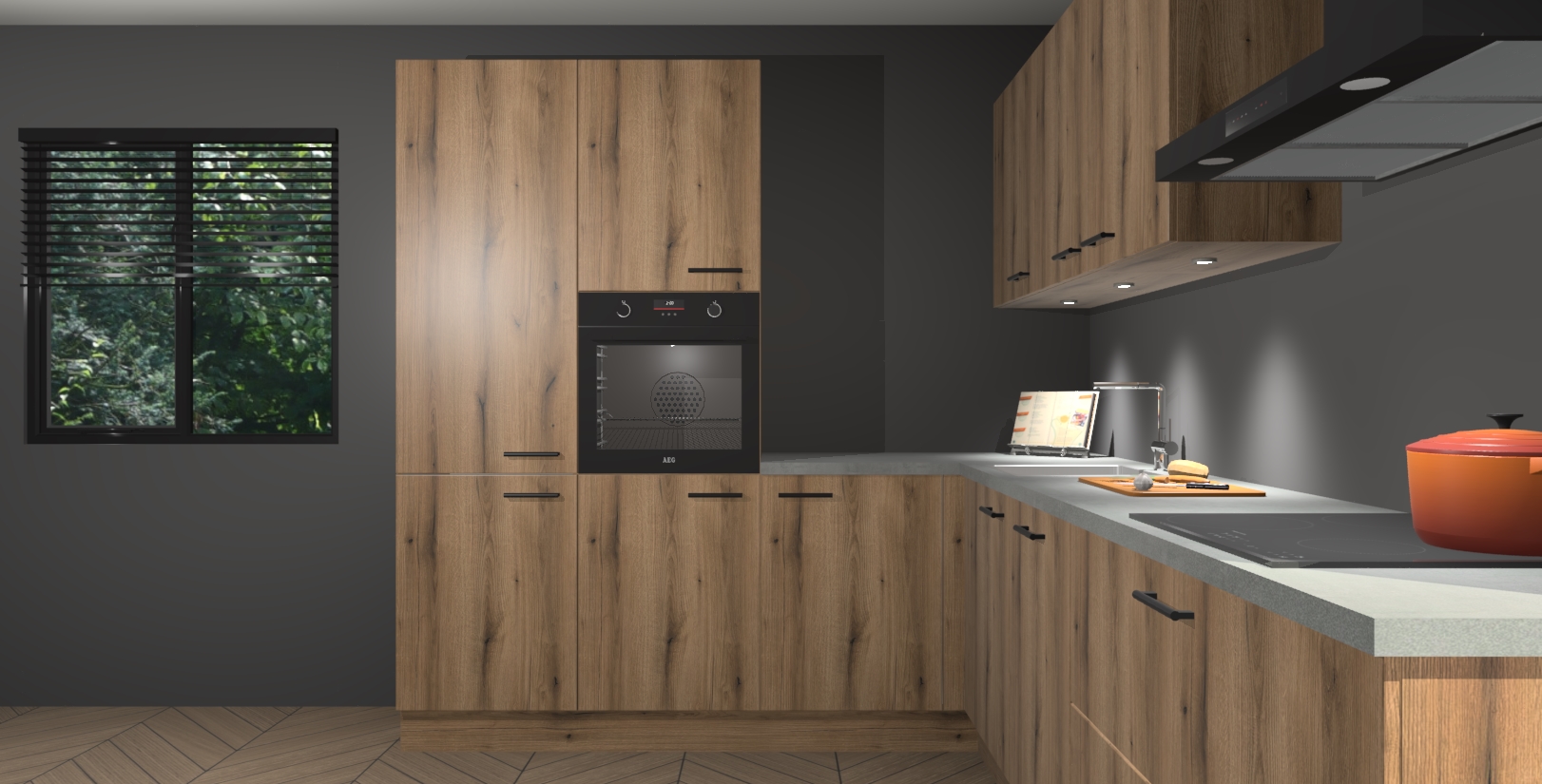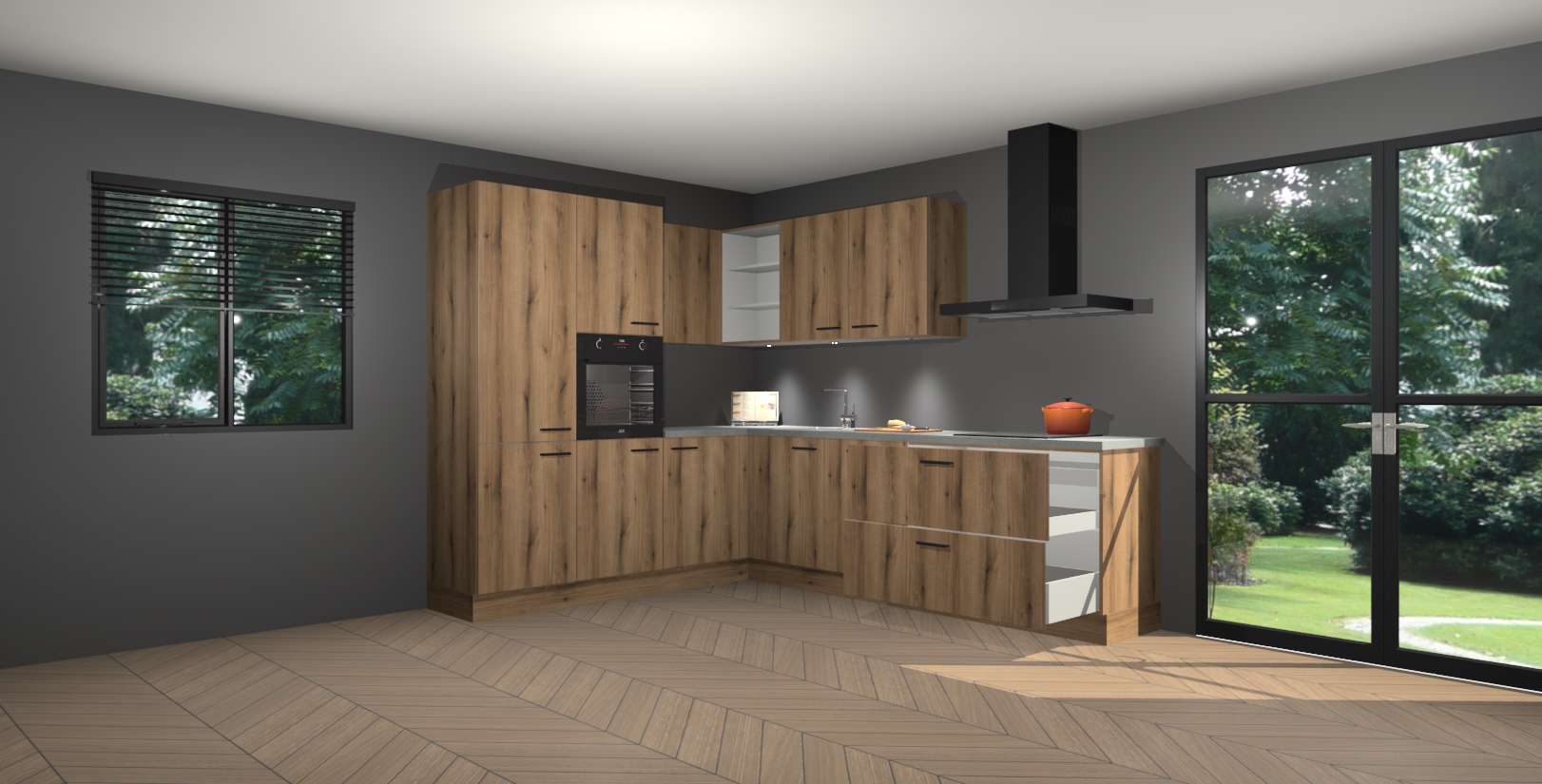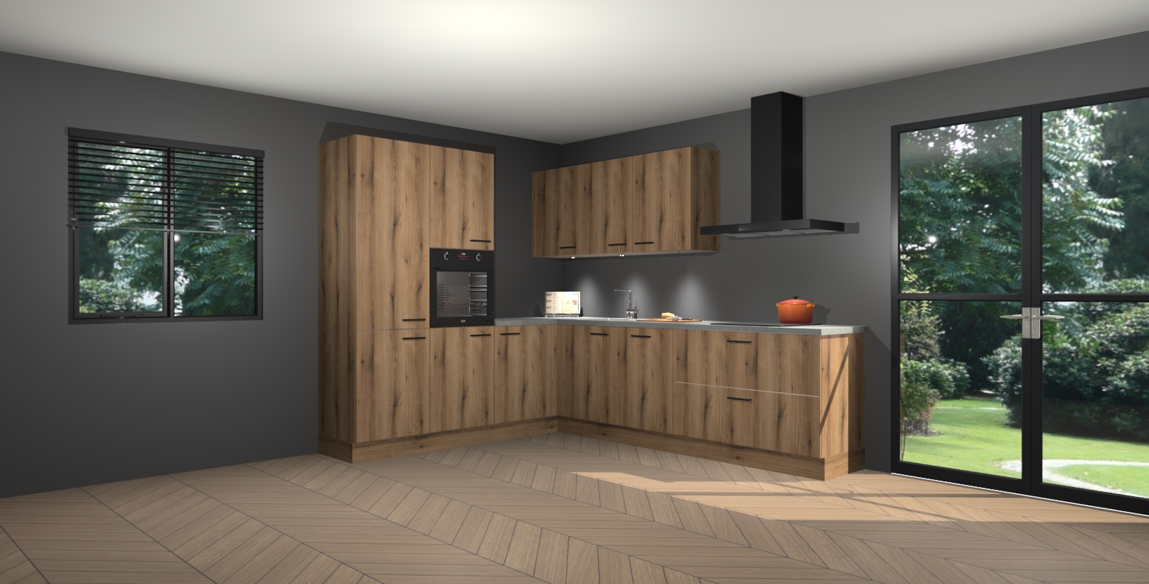 Maak kennis met de goud eiken keuken Parla - de perfecte aanvulling voor uw moderne keuken! Ervaar tijdloos design, elegantie en een chique uitstraling met onze zwarte handgrepen, soft-close deuren en veel opbergruimte. Dit alles wordt aangeboden tegen een vaste lage prijs voor ongeëvenaarde Duitse keukenkwaliteit!