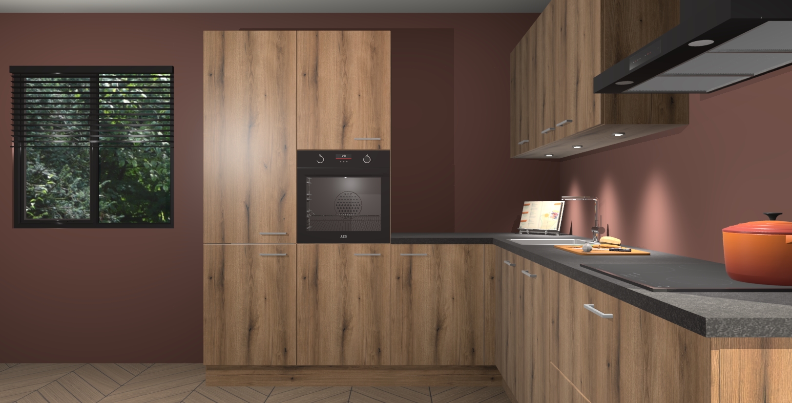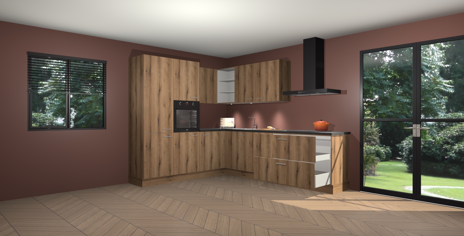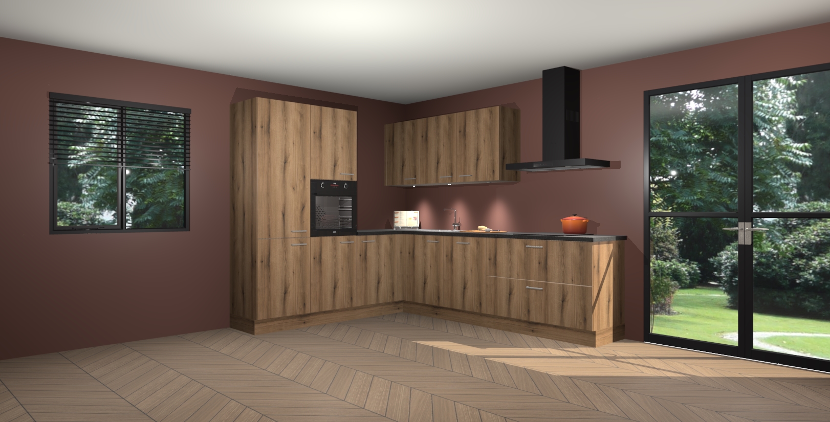 Maak kennis met de goud eiken keuken Parla - de perfecte aanvulling voor uw moderne keuken! Ervaar tijdloos design, elegantie en een chique uitstraling met onze zwarte handgrepen, soft-close deuren en veel opbergruimte. Dit alles wordt aangeboden tegen een vaste lage prijs voor ongeëvenaarde Duitse keukenkwaliteit!
