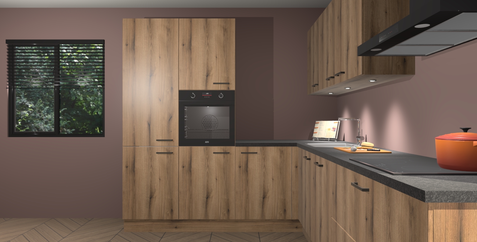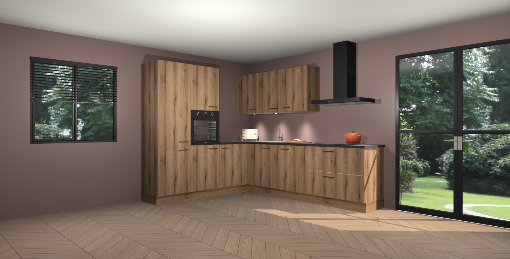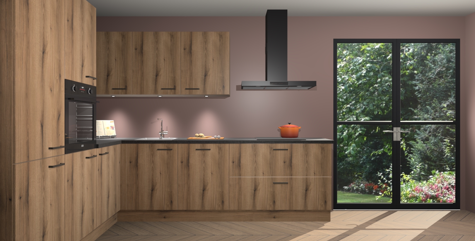 Maak kennis met de goud eiken keuken Parla - de perfecte aanvulling voor uw moderne keuken! Ervaar tijdloos design, elegantie en een chique uitstraling met onze zwarte handgrepen, soft-close deuren en veel opbergruimte. Dit alles wordt aangeboden tegen een vaste lage prijs voor ongeëvenaarde Duitse keukenkwaliteit!
