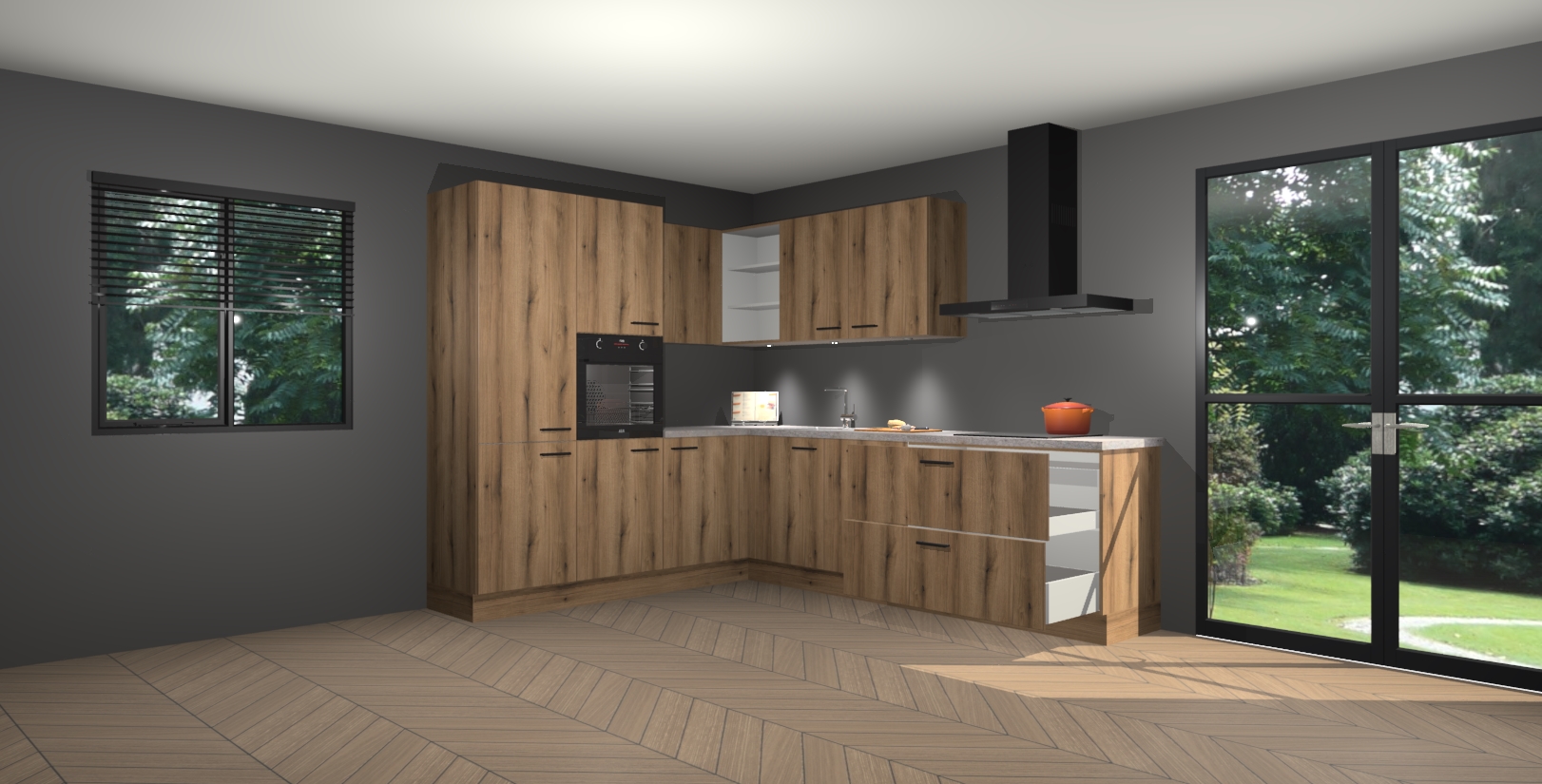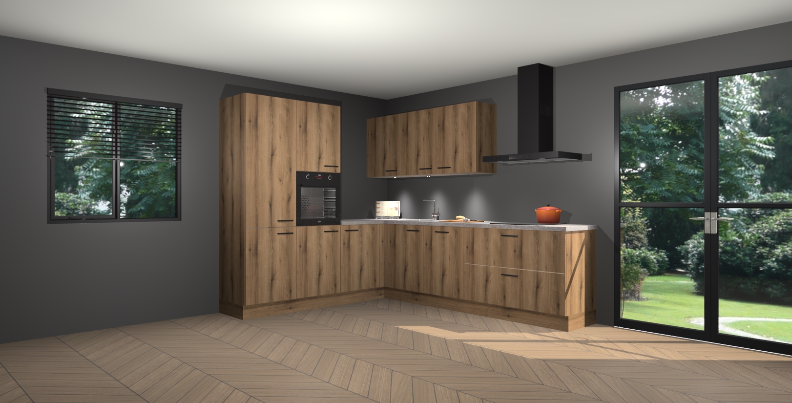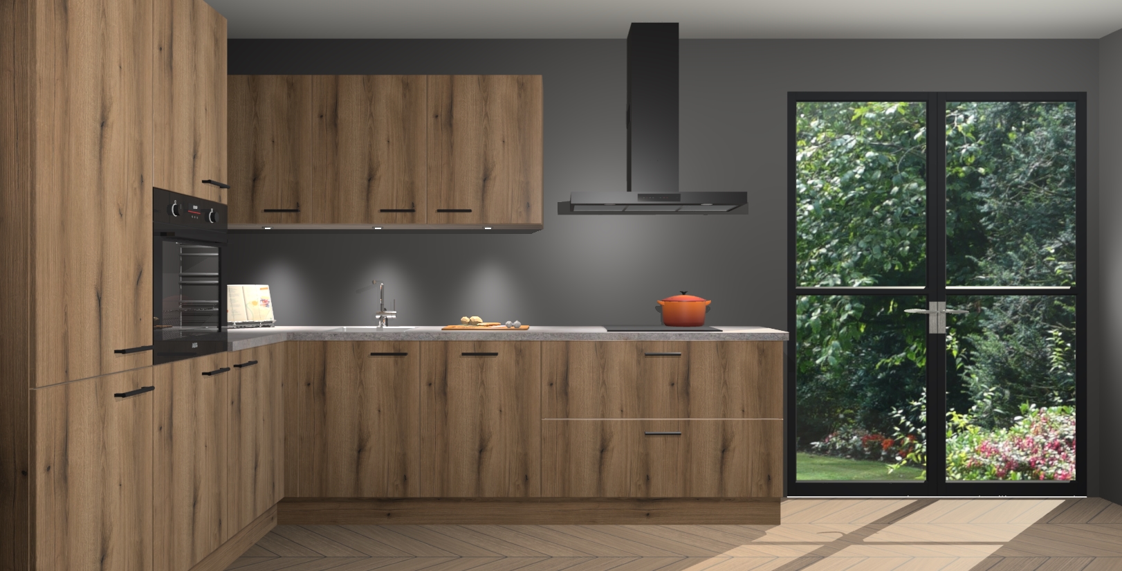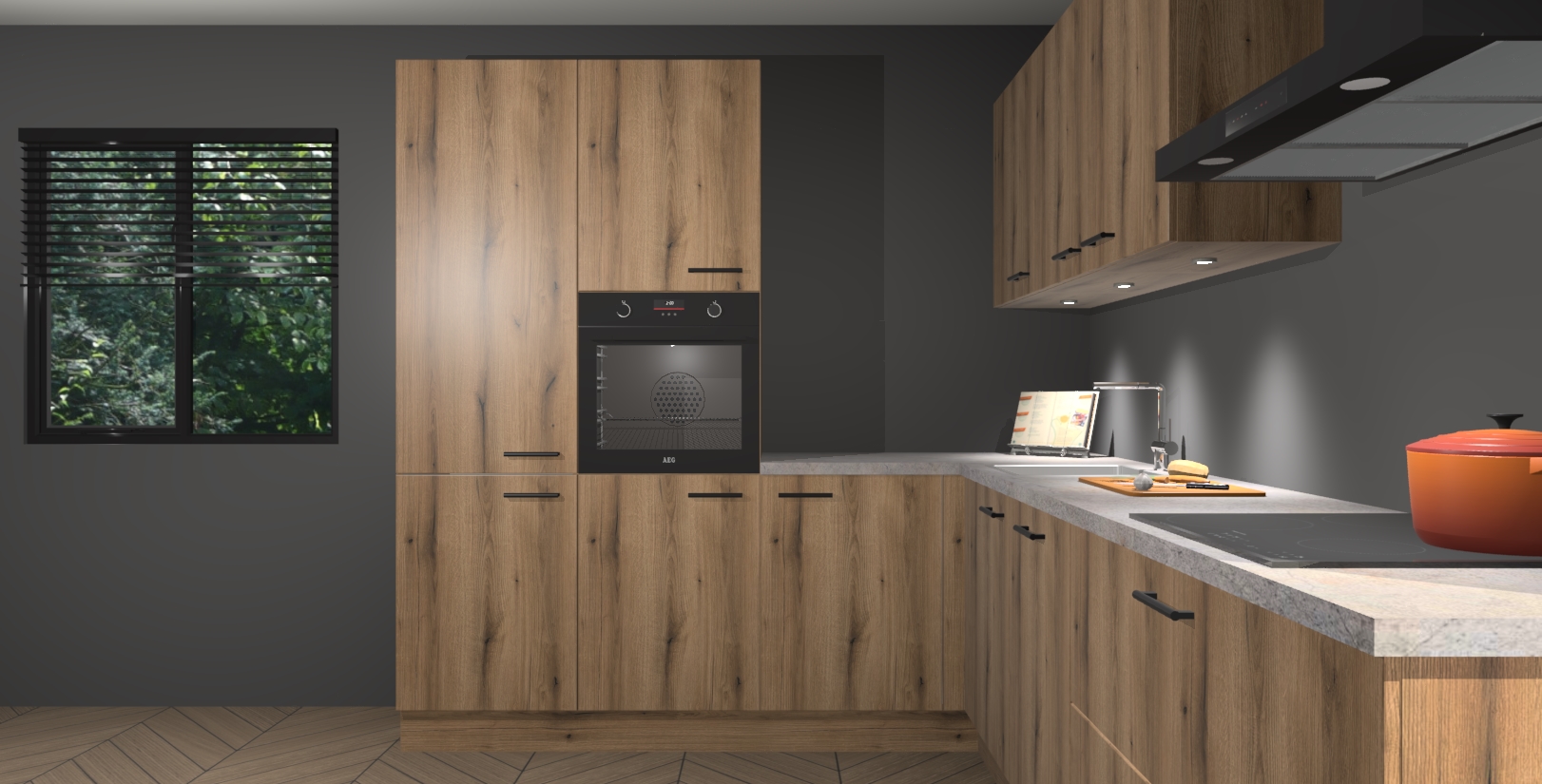 Maak kennis met de goud eiken keuken Parla - de perfecte aanvulling voor uw moderne keuken! Ervaar tijdloos design, elegantie en een chique uitstraling met onze zwarte handgrepen, soft-close deuren en veel opbergruimte. Dit alles wordt aangeboden tegen een vaste lage prijs voor ongeëvenaarde Duitse keukenkwaliteit!