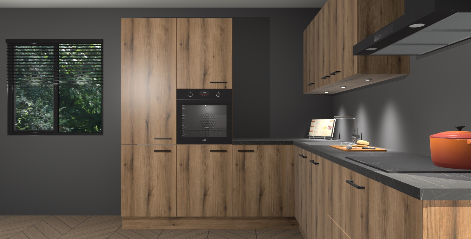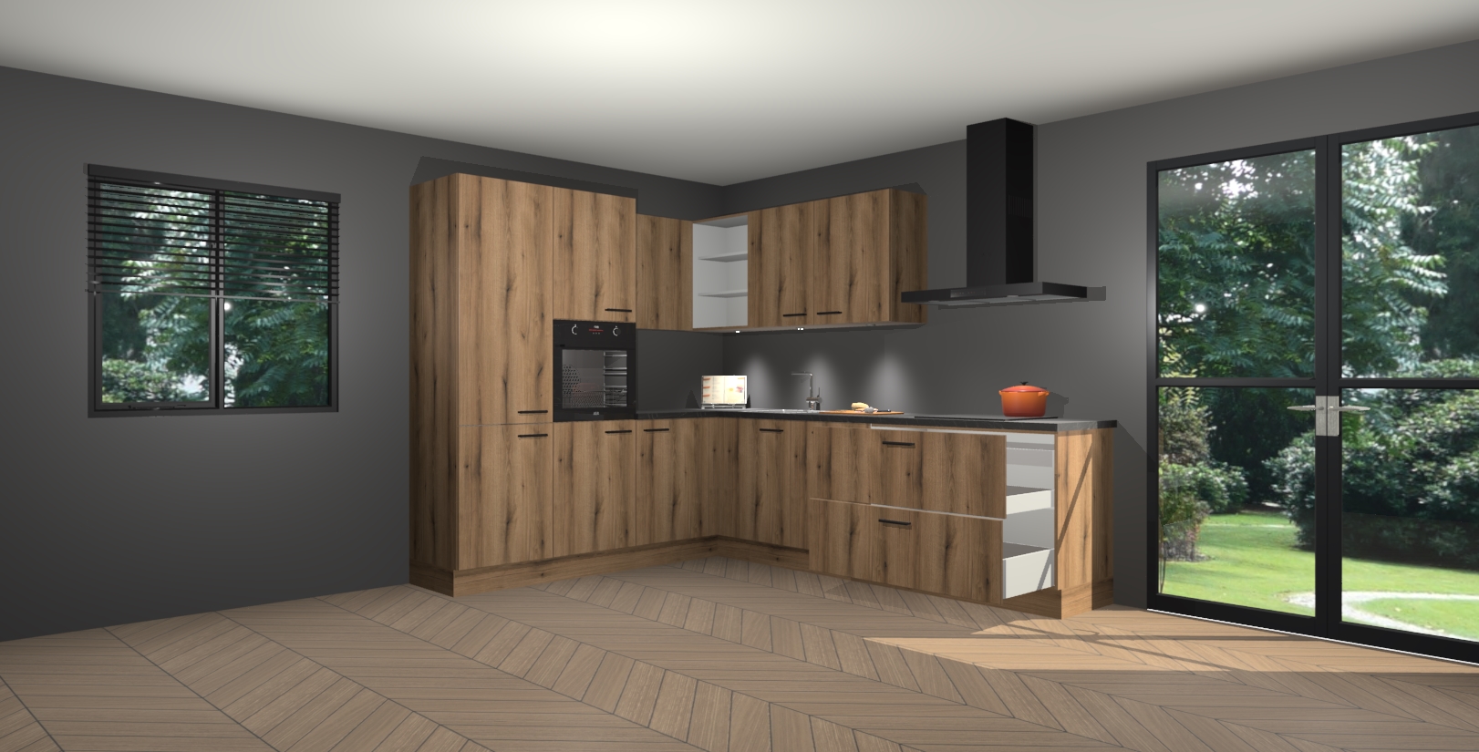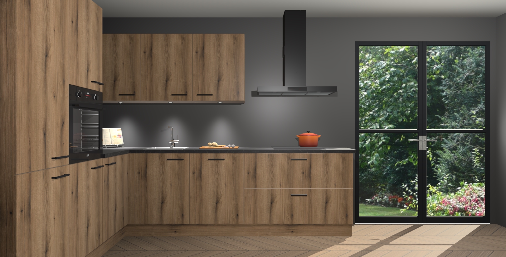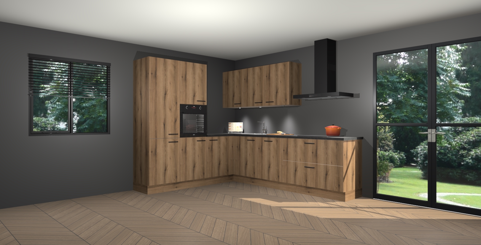 Maak kennis met de goud eiken keuken Parla - de perfecte aanvulling voor uw moderne keuken! Ervaar tijdloos design, elegantie en een chique uitstraling met onze zwarte handgrepen, soft-close deuren en veel opbergruimte. Dit alles wordt aangeboden tegen een vaste lage prijs voor ongeëvenaarde Duitse keukenkwaliteit!
