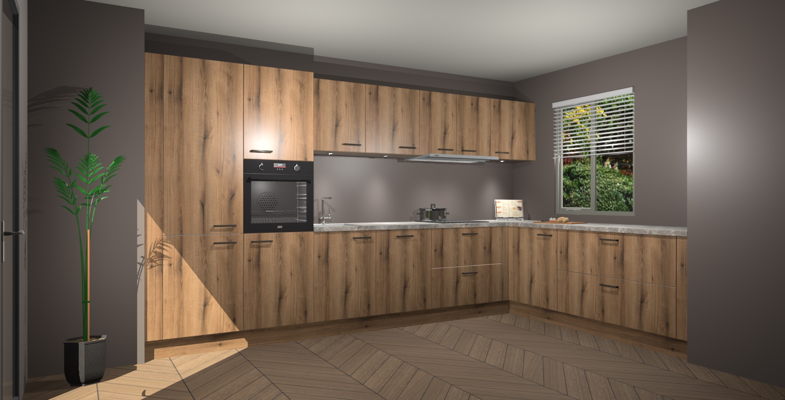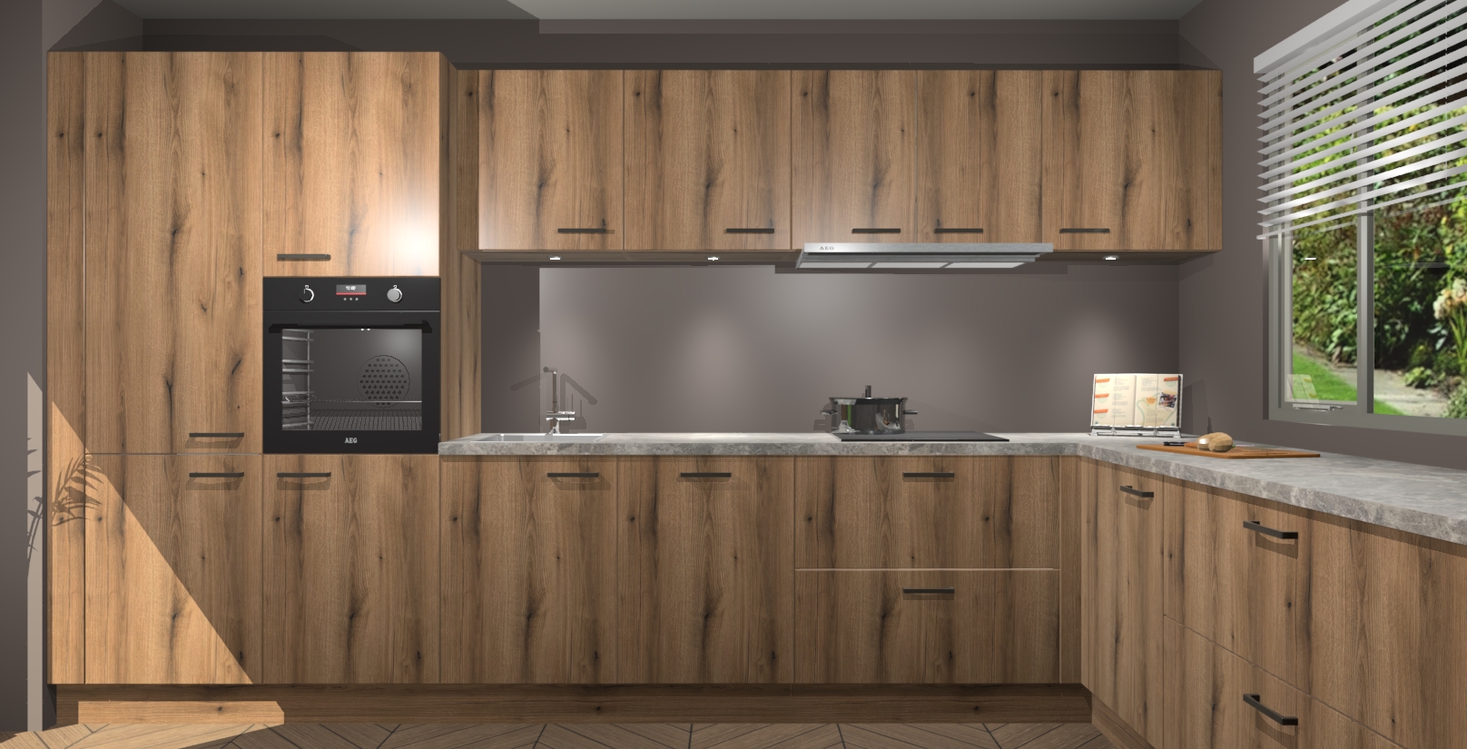 Verwelkom de natuurlijke warmte van de Goud Eiken keuken Petten in uw huis. Deze prachtige hoekkeuken met zijn moderne design en warme houten look geeft u meer dan genoeg opbergruimte om uw comfortabel te voelen in uw keuken. Geniet van soft-close deuren die al uw gasten het gevoel zullen geven dat ze zich in een luxueuze ruimte bevinden.