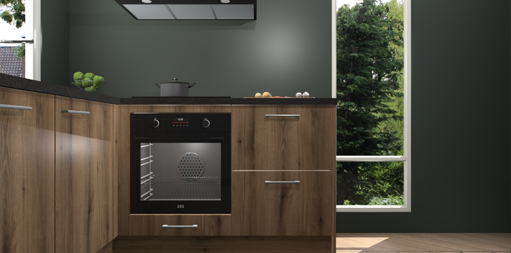 De Goud Eiken keuken Phuket heeft alles wat u maar kunt wensen. Niet alleen zijn er softclose deuren, maar ook 5 ingebouwde apparaten: een oven, inductiekookplaat, afzuigkap, vaatwasser en koelkast - waarbij u later gemakkelijk naar het AEG merk, van inductiekookplaat naar kookplaat met geïntegreerde afzuiging of van oven naar combimagnetron kunt upgraden. Dat alles tegen een vast laag tarief! Bovendien geeft de Goud Eiken keuken Phuket supersnelle levering van 7 weken. Echt iets voor u als u er niet op wilt wachten om het resultaat te zien in eigen keuken!