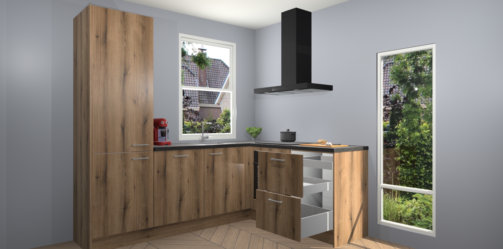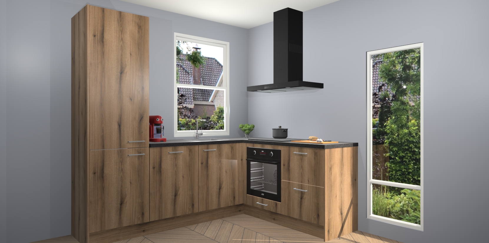 De prachtige Goud Eiken keuken Phuket is de perfecte keuze als u op zoek bent naar een moderne hoekkeuken met alle luxe en comfort die u kunt verwachten! De uitstraling in het houtlook-design draagt bij aan de warme sfeer die u nu al voelt wanneer u er naar kijkt. Heeft u genoeg van ouderwetse keukens? Probeer dan direct deze moderne, mooie hoekkeukens en laat iedereen verbluft achter!