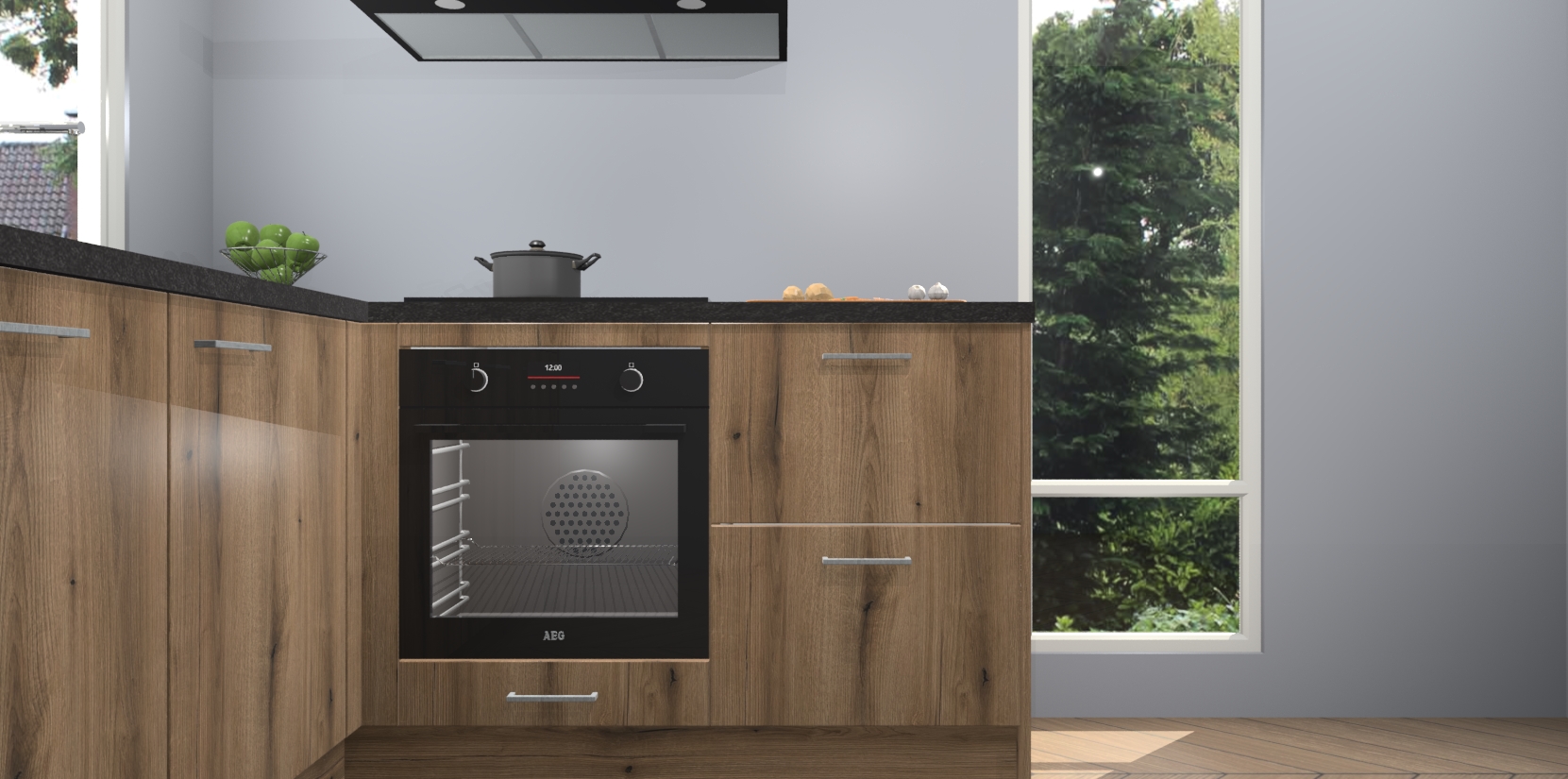 De Goud Eiken keuken Phuket heeft alles wat u maar kunt wensen. Niet alleen zijn er softclose deuren, maar ook 5 ingebouwde apparaten: een oven, inductiekookplaat, afzuigkap, vaatwasser en koelkast - waarbij u later gemakkelijk naar het AEG merk, van inductiekookplaat naar kookplaat met geïntegreerde afzuiging of van oven naar combimagnetron kunt upgraden. Dat alles tegen een vast laag tarief! Bovendien geeft de Goud Eiken keuken Phuket supersnelle levering van 7 weken. Echt iets voor u als u er niet op wilt wachten om het resultaat te zien in eigen keuken!