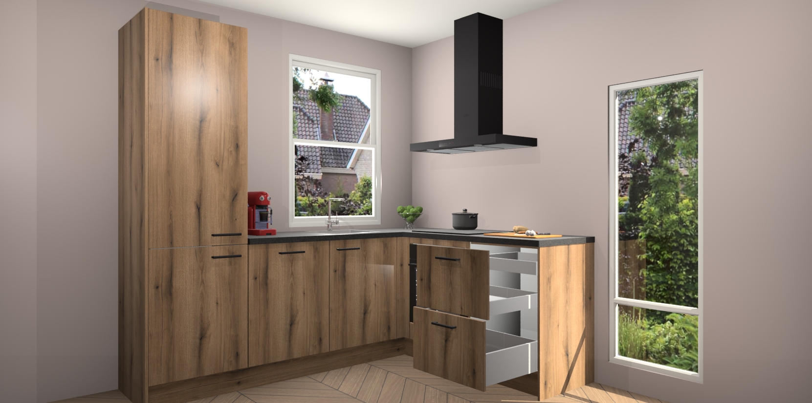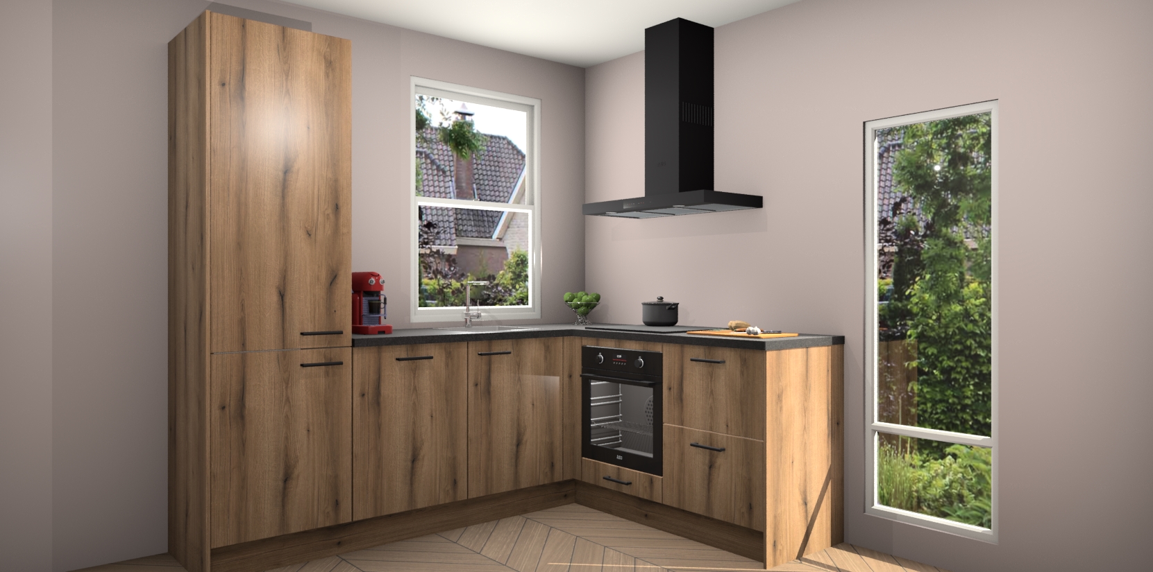 De prachtige Goud Eiken keuken Phuket is de perfecte keuze als u op zoek bent naar een moderne hoekkeuken met alle luxe en comfort die u kunt verwachten! De uitstraling in het houtlook-design draagt bij aan de warme sfeer die u nu al voelt wanneer u er naar kijkt. Heeft u genoeg van ouderwetse keukens? Probeer dan direct deze moderne, mooie hoekkeukens en laat iedereen verbluft achter!