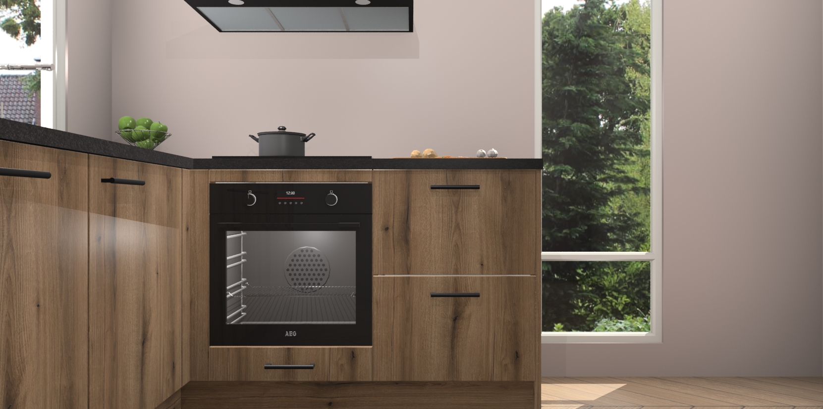 De Goud Eiken keuken Phuket heeft alles wat u maar kunt wensen. Niet alleen zijn er softclose deuren, maar ook 5 ingebouwde apparaten: een oven, inductiekookplaat, afzuigkap, vaatwasser en koelkast - waarbij u later gemakkelijk naar het AEG merk, van inductiekookplaat naar kookplaat met geïntegreerde afzuiging of van oven naar combimagnetron kunt upgraden. Dat alles tegen een vast laag tarief! Bovendien geeft de Goud Eiken keuken Phuket supersnelle levering van 7 weken. Echt iets voor u als u er niet op wilt wachten om het resultaat te zien in eigen keuken!