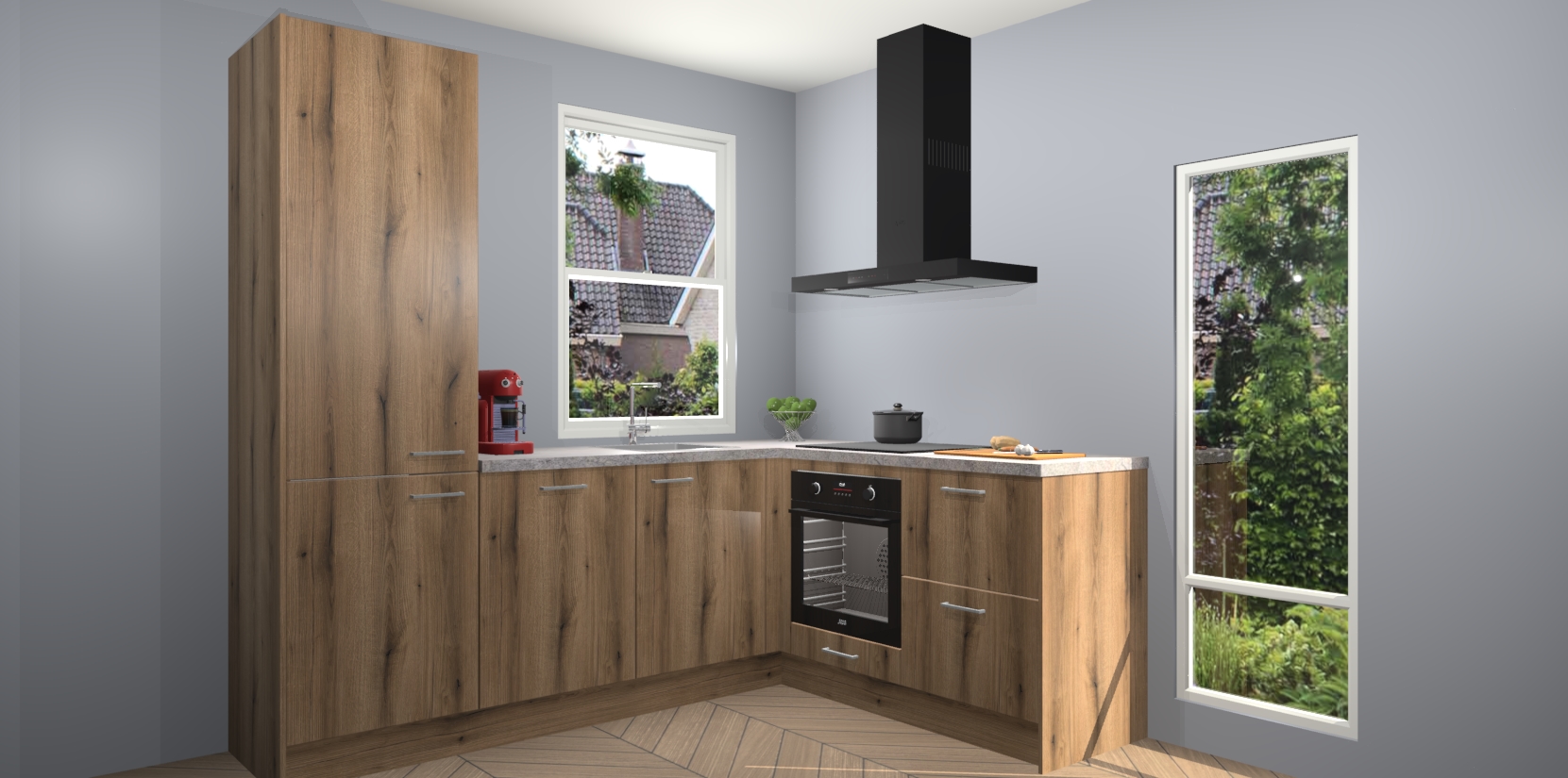 De prachtige Goud Eiken keuken Phuket is de perfecte keuze als u op zoek bent naar een moderne hoekkeuken met alle luxe en comfort die u kunt verwachten! De uitstraling in het houtlook-design draagt bij aan de warme sfeer die u nu al voelt wanneer u er naar kijkt. Heeft u genoeg van ouderwetse keukens? Probeer dan direct deze moderne, mooie hoekkeukens en laat iedereen verbluft achter!