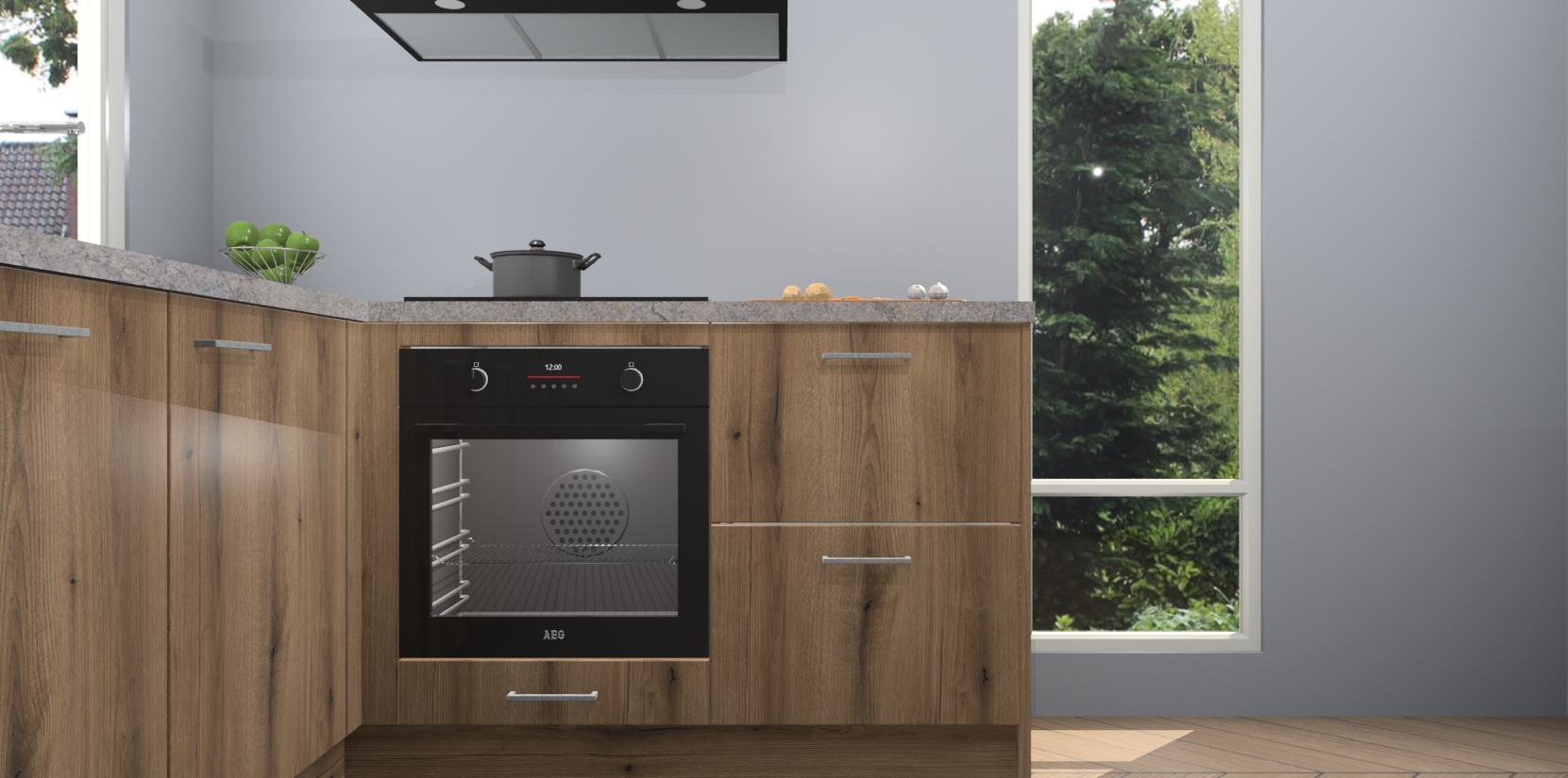 De Goud Eiken keuken Phuket heeft alles wat u maar kunt wensen. Niet alleen zijn er softclose deuren, maar ook 5 ingebouwde apparaten: een oven, inductiekookplaat, afzuigkap, vaatwasser en koelkast - waarbij u later gemakkelijk naar het AEG merk, van inductiekookplaat naar kookplaat met geïntegreerde afzuiging of van oven naar combimagnetron kunt upgraden. Dat alles tegen een vast laag tarief! Bovendien geeft de Goud Eiken keuken Phuket supersnelle levering van 7 weken. Echt iets voor u als u er niet op wilt wachten om het resultaat te zien in eigen keuken!