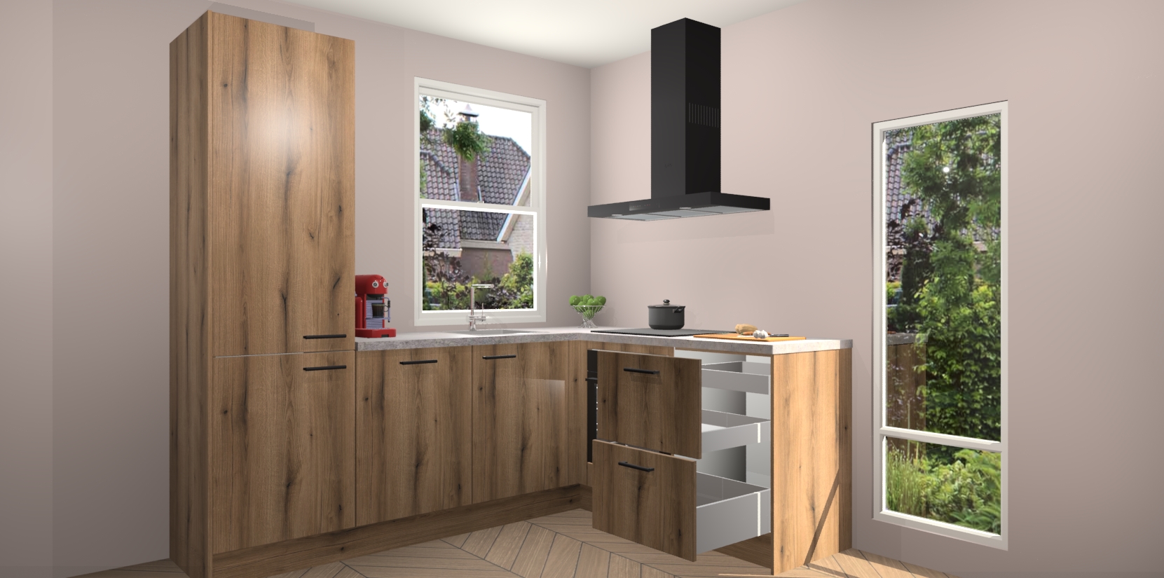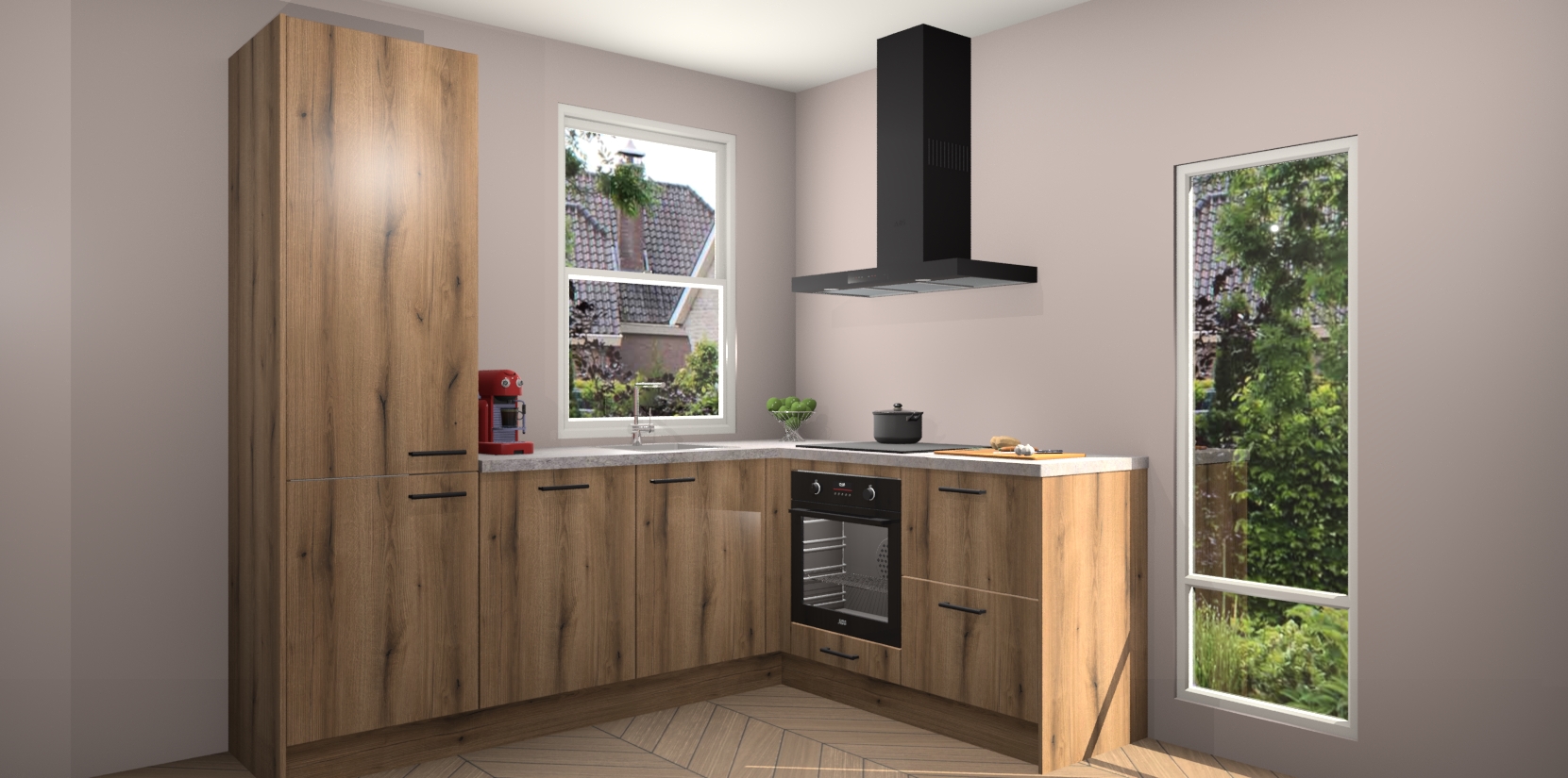 De prachtige Goud Eiken keuken Phuket is de perfecte keuze als u op zoek bent naar een moderne hoekkeuken met alle luxe en comfort die u kunt verwachten! De uitstraling in het houtlook-design draagt bij aan de warme sfeer die u nu al voelt wanneer u er naar kijkt. Heeft u genoeg van ouderwetse keukens? Probeer dan direct deze moderne, mooie hoekkeukens en laat iedereen verbluft achter!