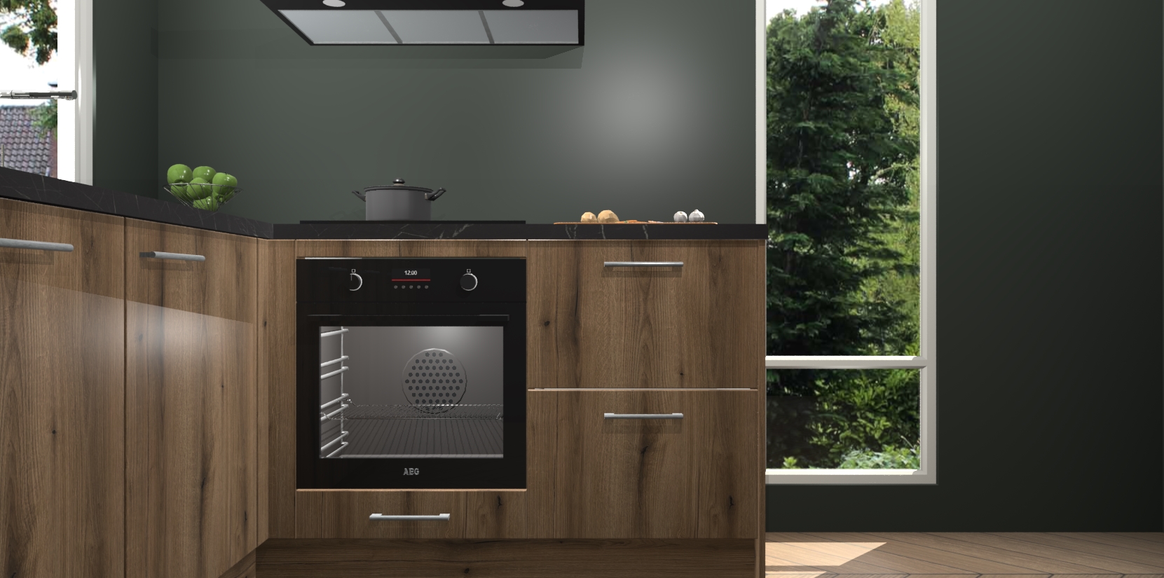 De Goud Eiken keuken Phuket heeft alles wat u maar kunt wensen. Niet alleen zijn er softclose deuren, maar ook 5 ingebouwde apparaten: een oven, inductiekookplaat, afzuigkap, vaatwasser en koelkast - waarbij u later gemakkelijk naar het AEG merk, van inductiekookplaat naar kookplaat met geïntegreerde afzuiging of van oven naar combimagnetron kunt upgraden. Dat alles tegen een vast laag tarief! Bovendien geeft de Goud Eiken keuken Phuket supersnelle levering van 7 weken. Echt iets voor u als u er niet op wilt wachten om het resultaat te zien in eigen keuken!