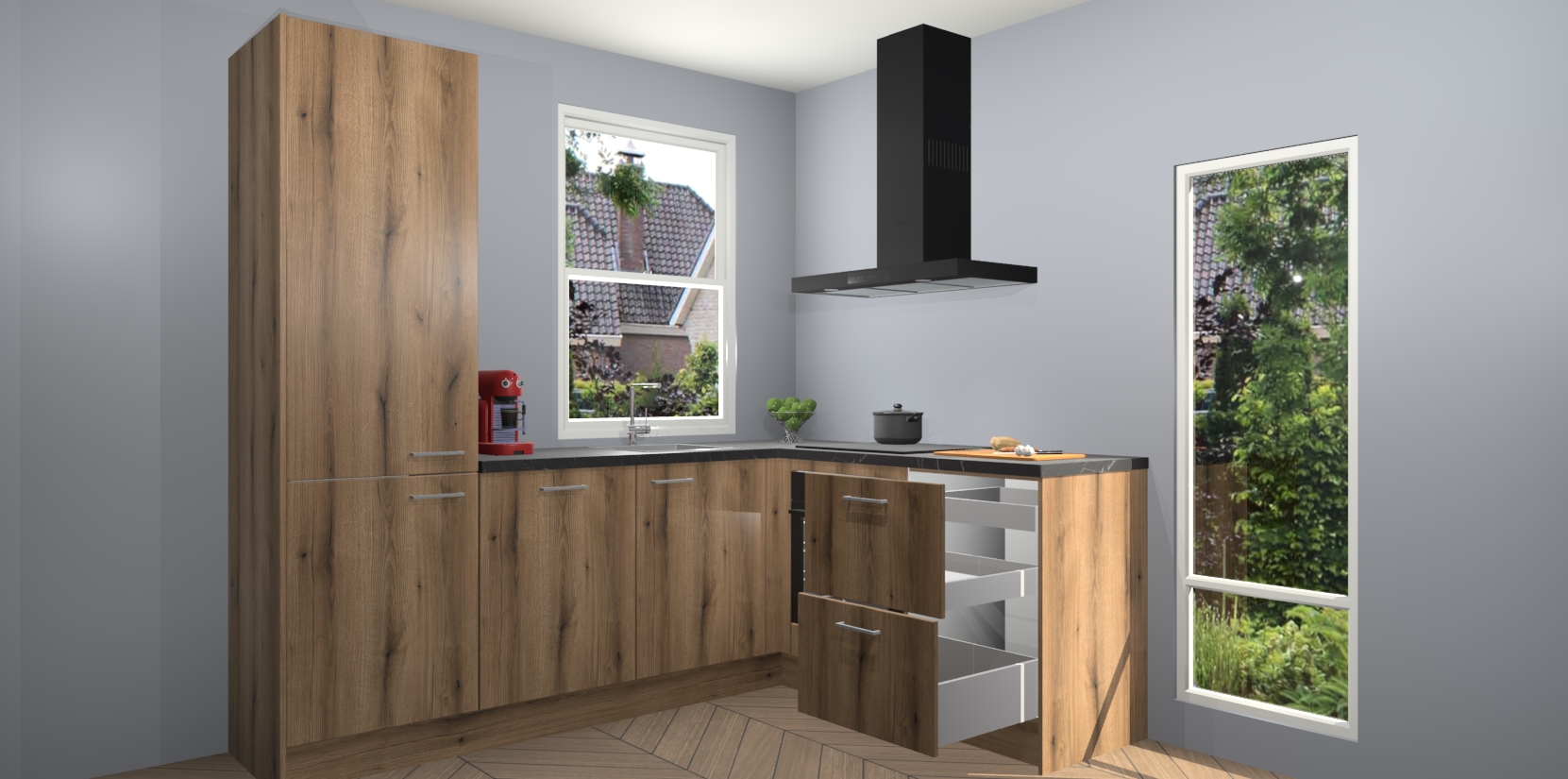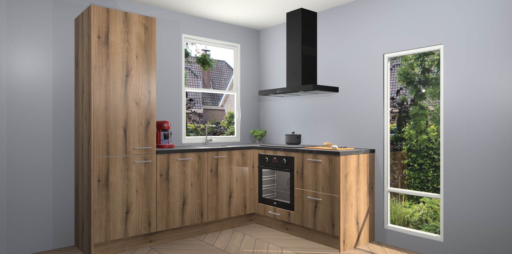 De prachtige Goud Eiken keuken Phuket is de perfecte keuze als u op zoek bent naar een moderne hoekkeuken met alle luxe en comfort die u kunt verwachten! De uitstraling in het houtlook-design draagt bij aan de warme sfeer die u nu al voelt wanneer u er naar kijkt. Heeft u genoeg van ouderwetse keukens? Probeer dan direct deze moderne, mooie hoekkeukens en laat iedereen verbluft achter!