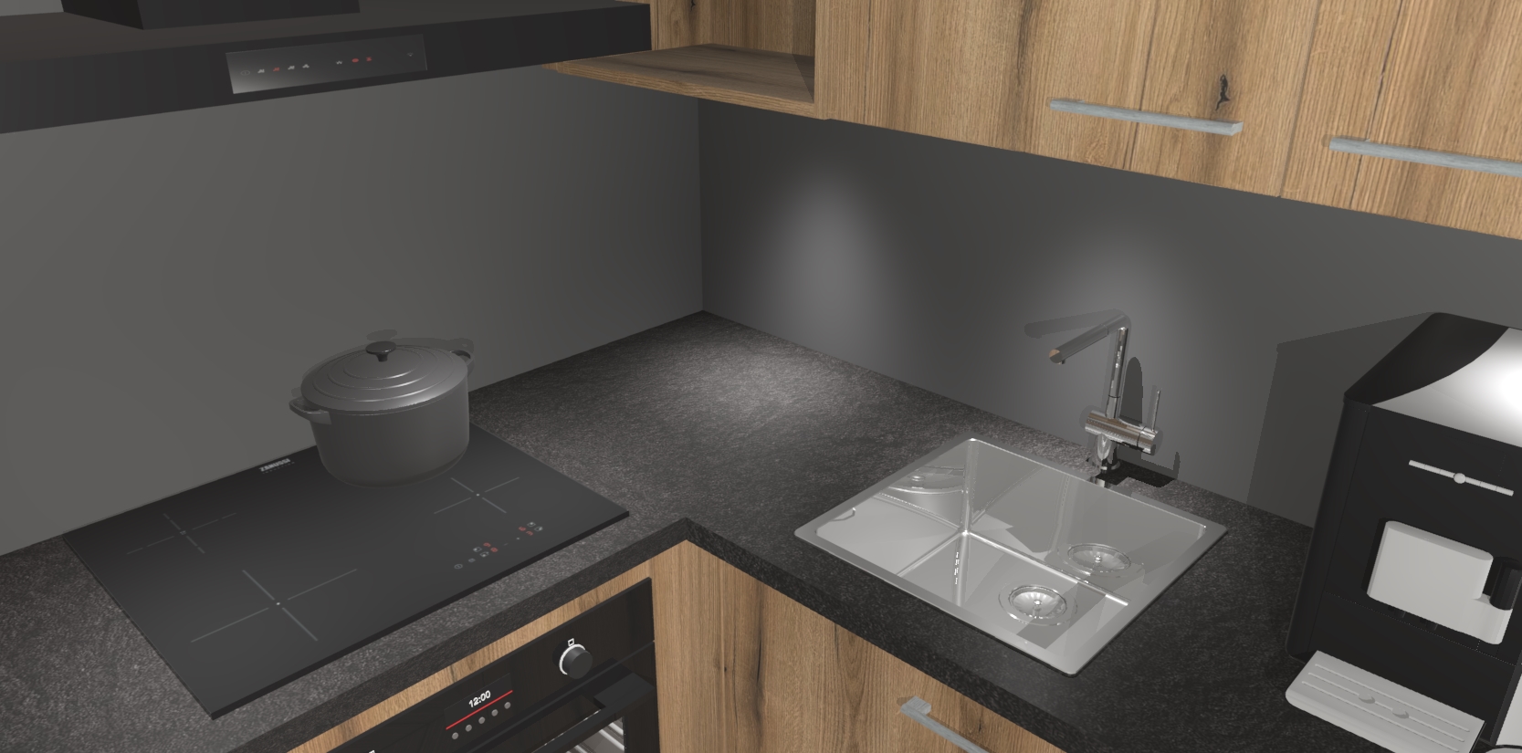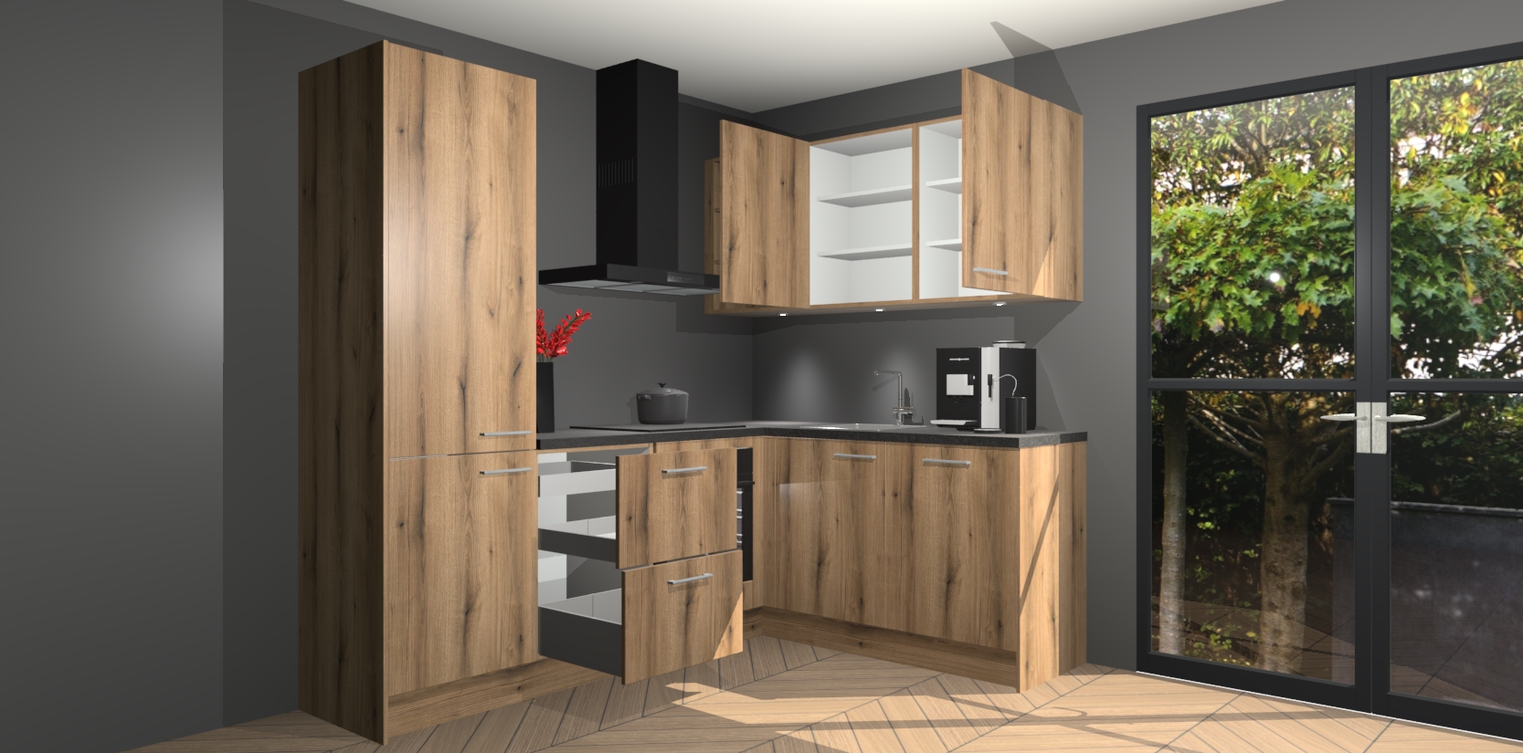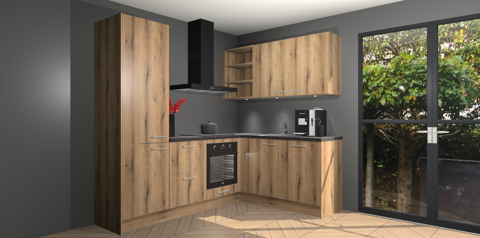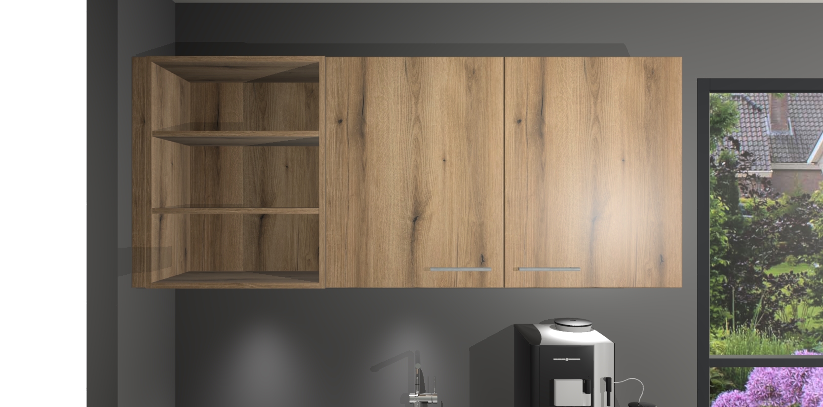 Wauw, dit is de Goud Eiken keuken Pilsen! U kunt gerust zeggen dat u elegantie combineert met functionaliteit met deze keuken. Met een modern en chique ontwerp is de keuken precies wat u nodig heeft om uw ruimte te verfraaien. De binnenzijde van de kasten is in dezelfde donkere kleur als de buitenzijde voor een uniforme look, compleet met softclose-kasten die stil sluiten.