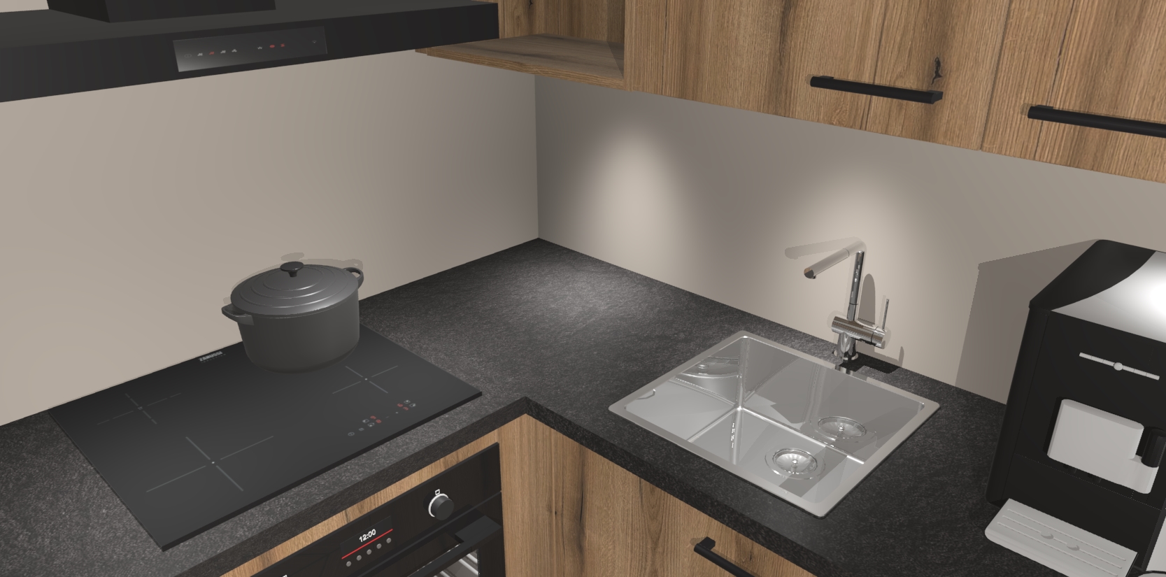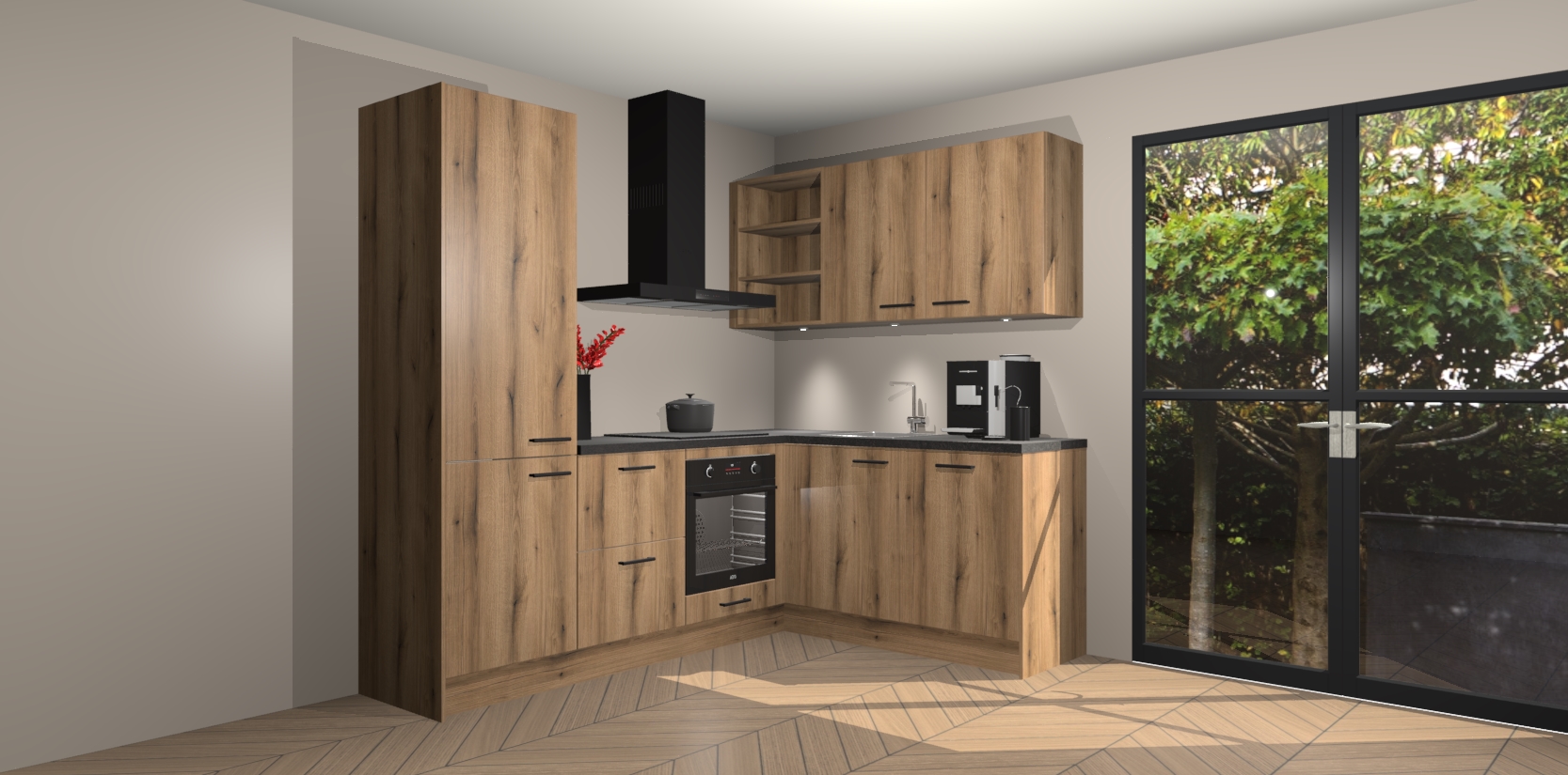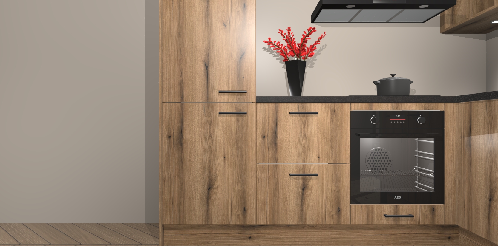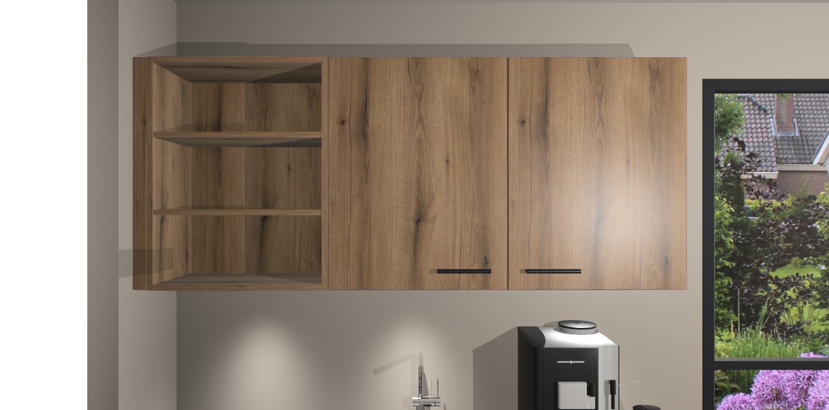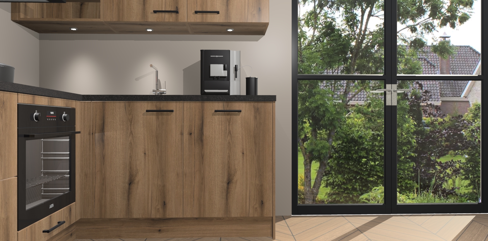Wauw, dit is de Goud Eiken keuken Pilsen! U kunt gerust zeggen dat u elegantie combineert met functionaliteit met deze keuken. Met een modern en chique ontwerp is de keuken precies wat u nodig heeft om uw ruimte te verfraaien. De binnenzijde van de kasten is in dezelfde donkere kleur als de buitenzijde voor een uniforme look, compleet met softclose-kasten die stil sluiten.