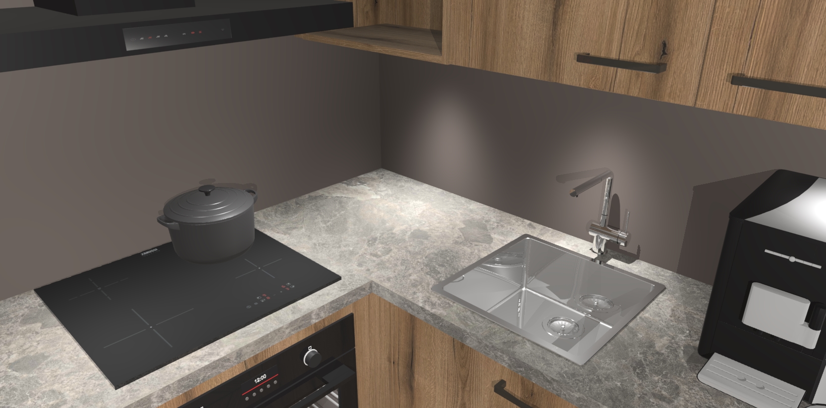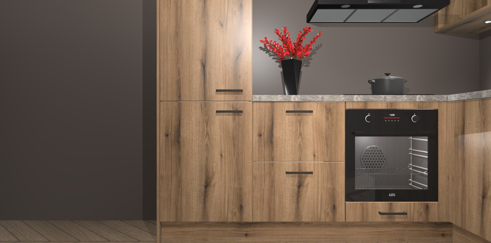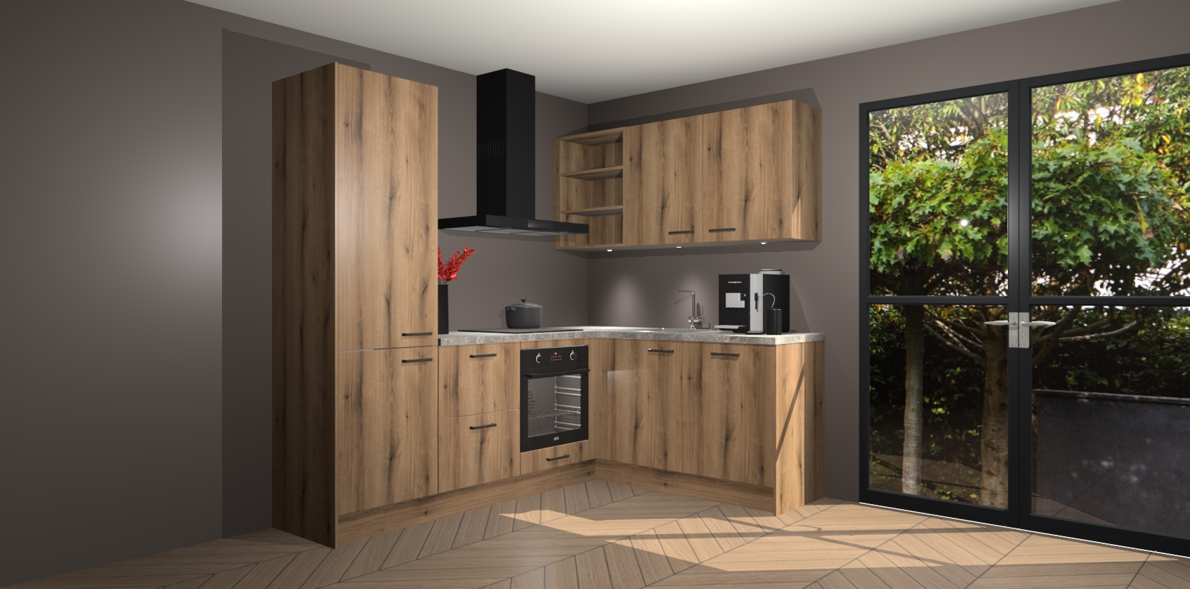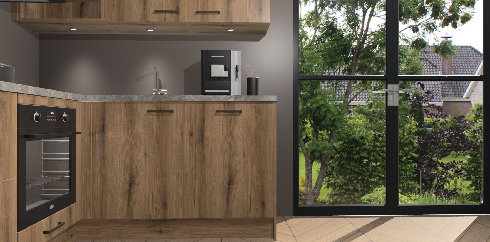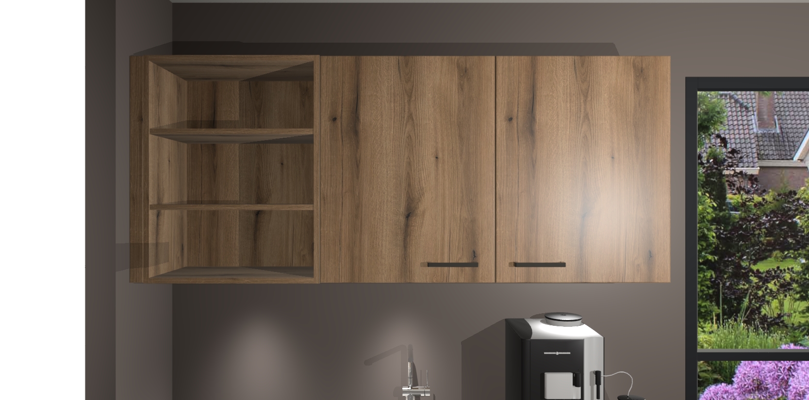Wauw, dit is de Goud Eiken keuken Pilsen! U kunt gerust zeggen dat u elegantie combineert met functionaliteit met deze keuken. Met een modern en chique ontwerp is de keuken precies wat u nodig heeft om uw ruimte te verfraaien. De binnenzijde van de kasten is in dezelfde donkere kleur als de buitenzijde voor een uniforme look, compleet met softclose-kasten die stil sluiten.