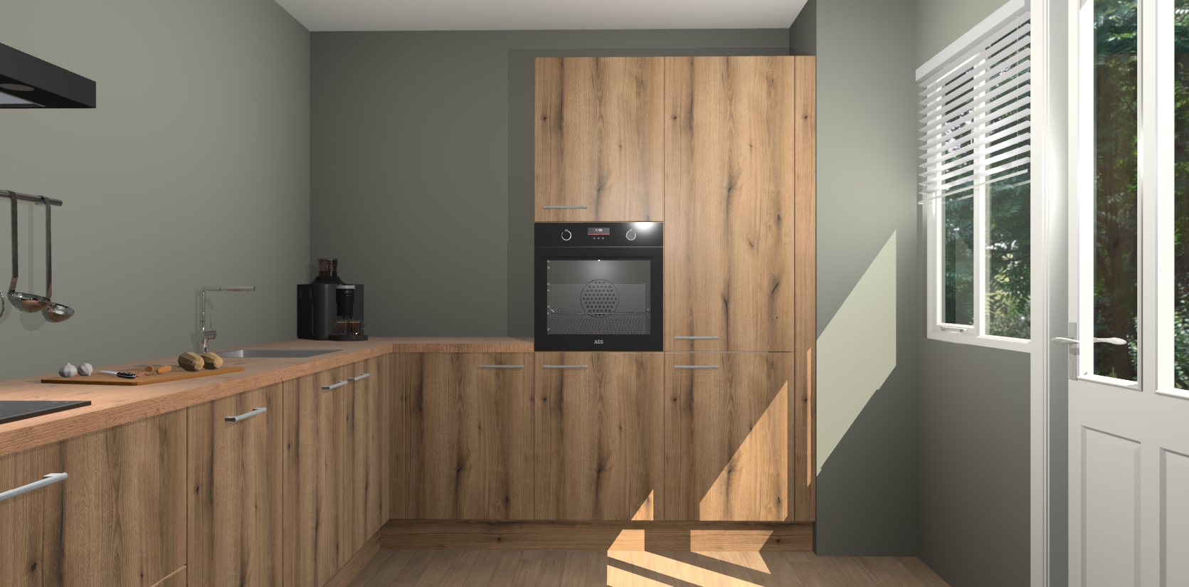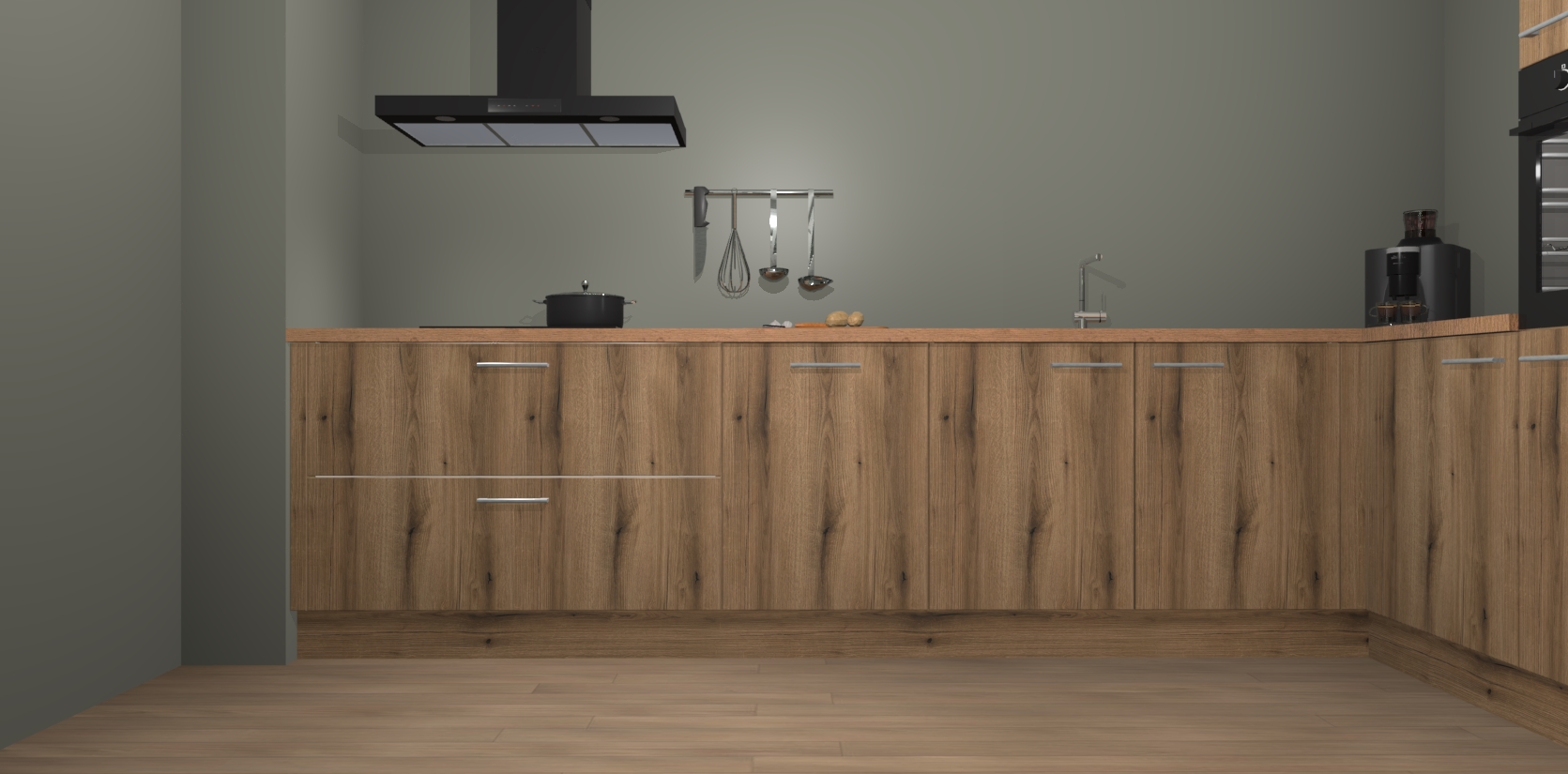 Welkom bij de Goud Eiken keuken Portland. Deze prachtige keuken zal de komende jaren het middelpunt van de belangstelling in uw huis zijn. Uitgerust met vijf inbouwapparaten komt u nooit kookgereedschap tekort. Bovendien geeft de warme houtlook elke ruimte een uitnodigende en tijdloze uitstraling.