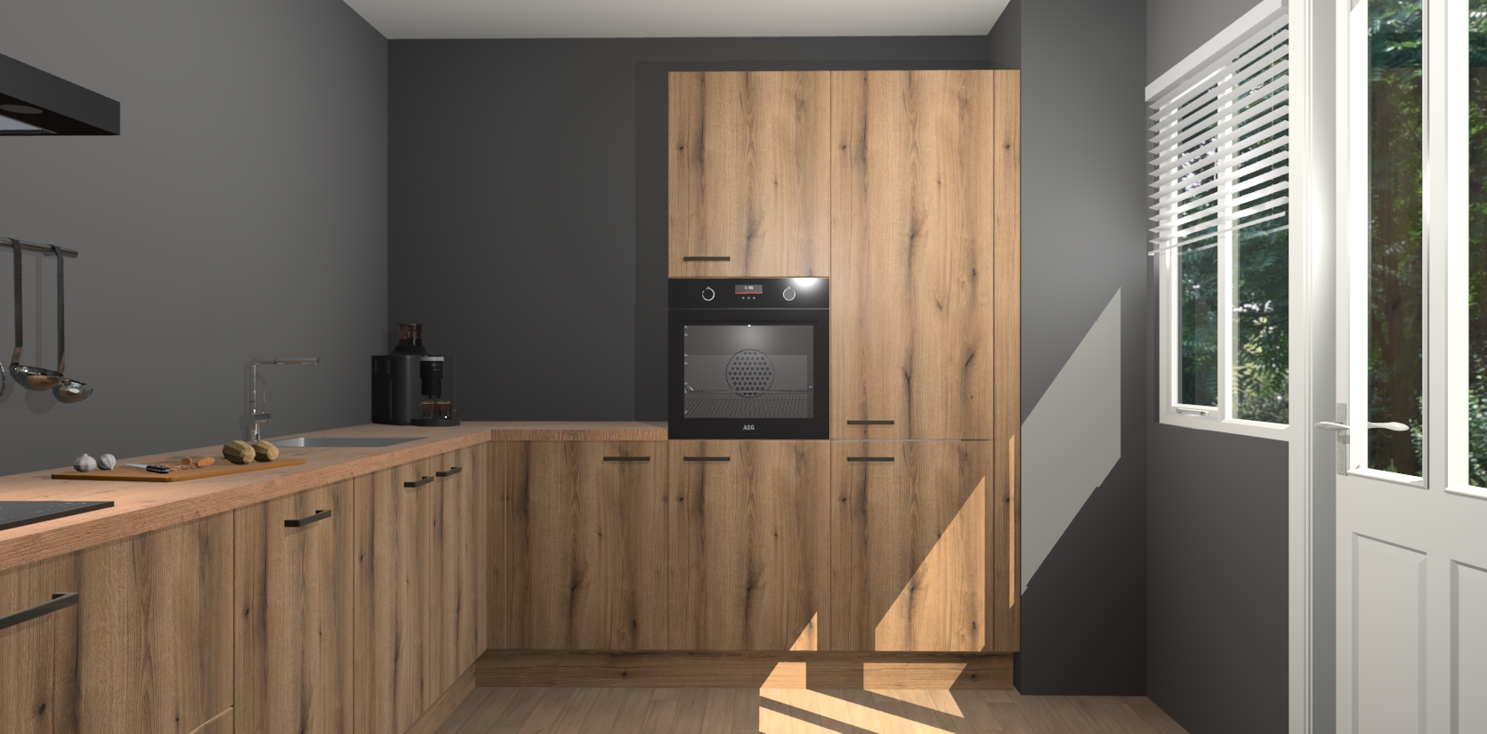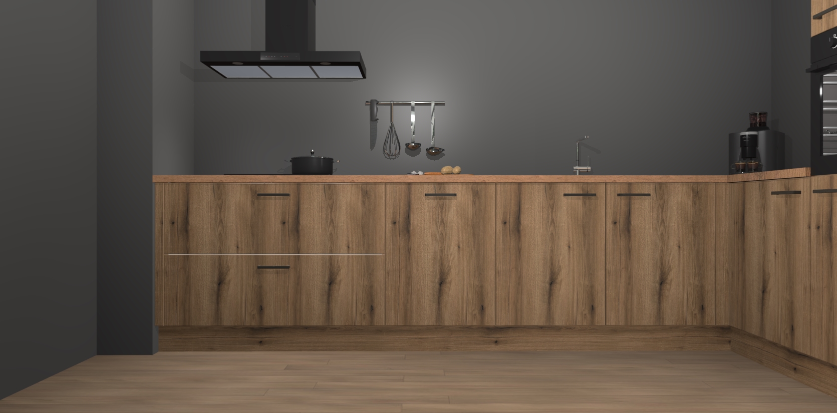 Welkom bij de Goud Eiken keuken Portland. Deze prachtige keuken zal de komende jaren het middelpunt van de belangstelling in uw huis zijn. Uitgerust met vijf inbouwapparaten komt u nooit kookgereedschap tekort. Bovendien geeft de warme houtlook elke ruimte een uitnodigende en tijdloze uitstraling.