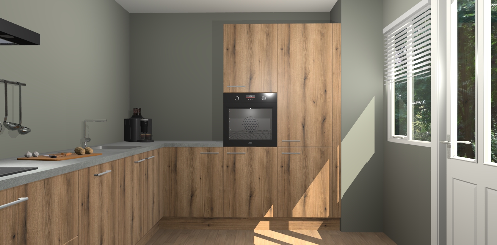 Welkom bij de Goud Eiken keuken Portland. Deze prachtige keuken zal de komende jaren het middelpunt van de belangstelling in uw huis zijn. Uitgerust met vijf inbouwapparaten komt u nooit kookgereedschap tekort. Bovendien geeft de warme houtlook elke ruimte een uitnodigende en tijdloze uitstraling.