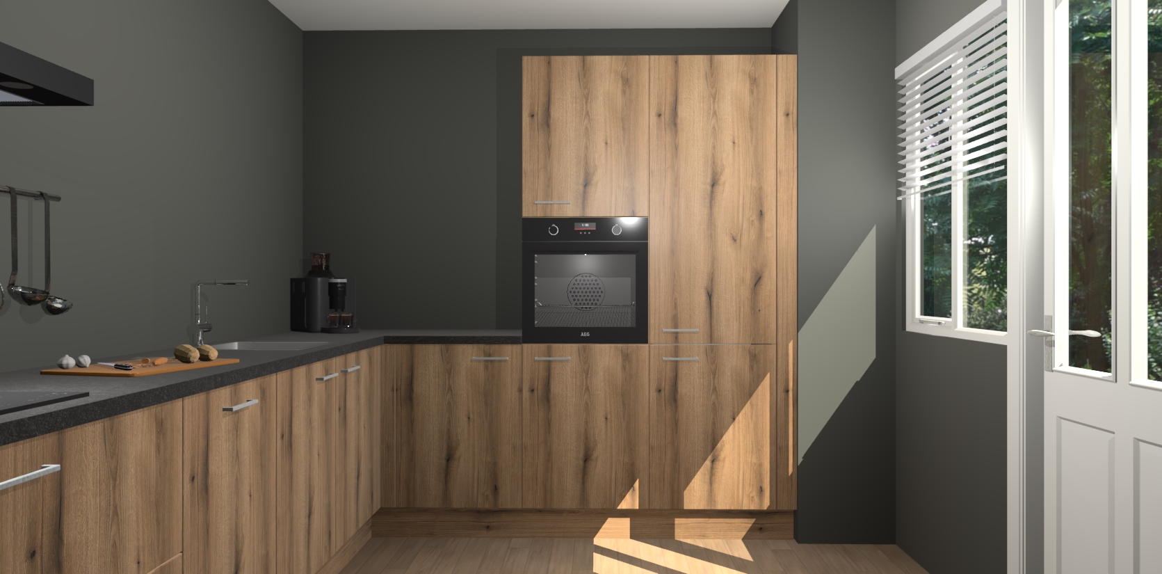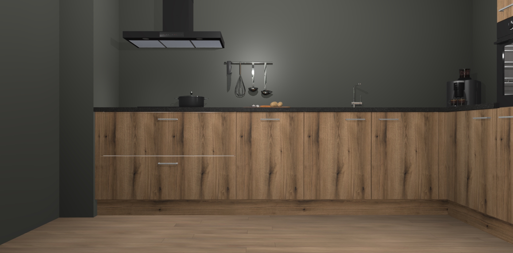 Welkom bij de Goud Eiken keuken Portland. Deze prachtige keuken zal de komende jaren het middelpunt van de belangstelling in uw huis zijn. Uitgerust met vijf inbouwapparaten komt u nooit kookgereedschap tekort. Bovendien geeft de warme houtlook elke ruimte een uitnodigende en tijdloze uitstraling.