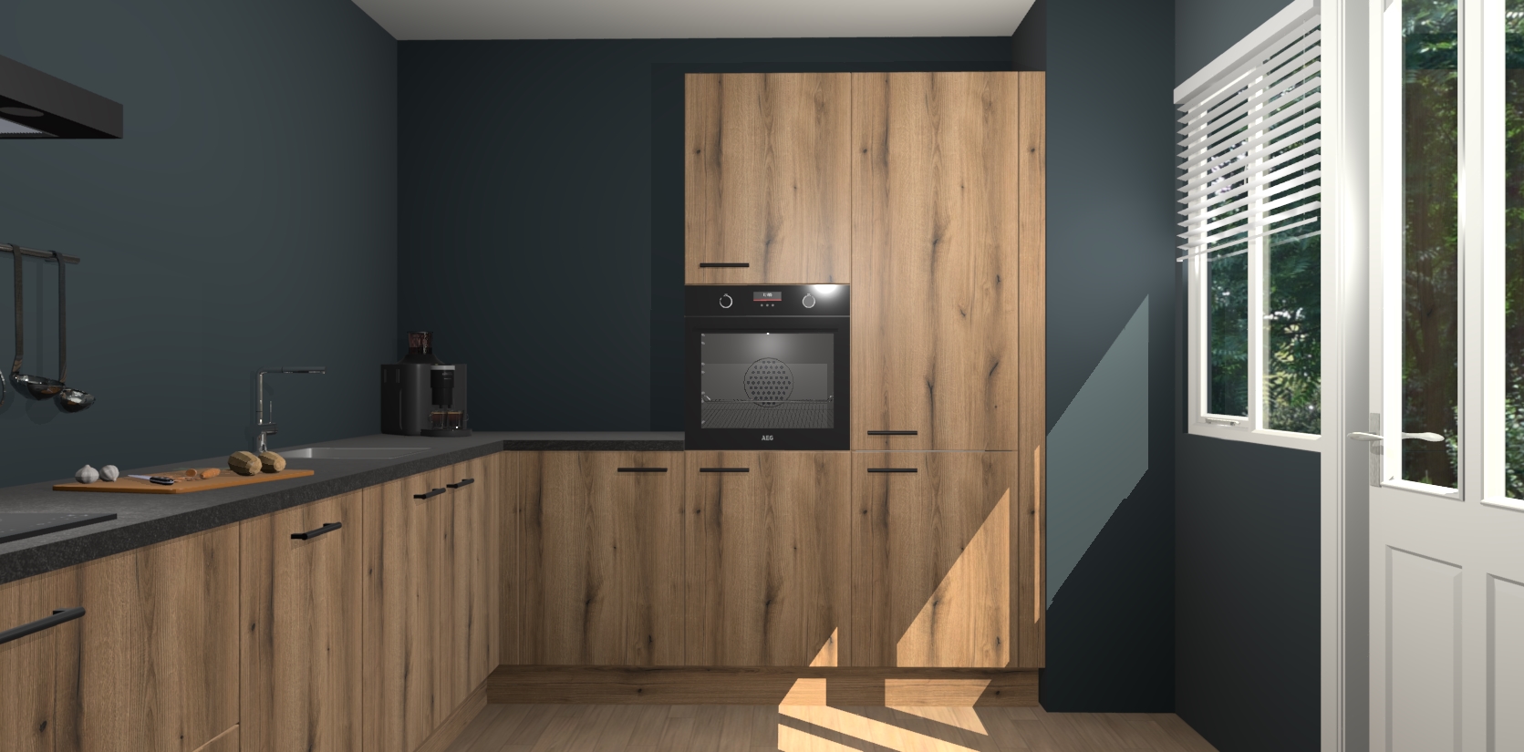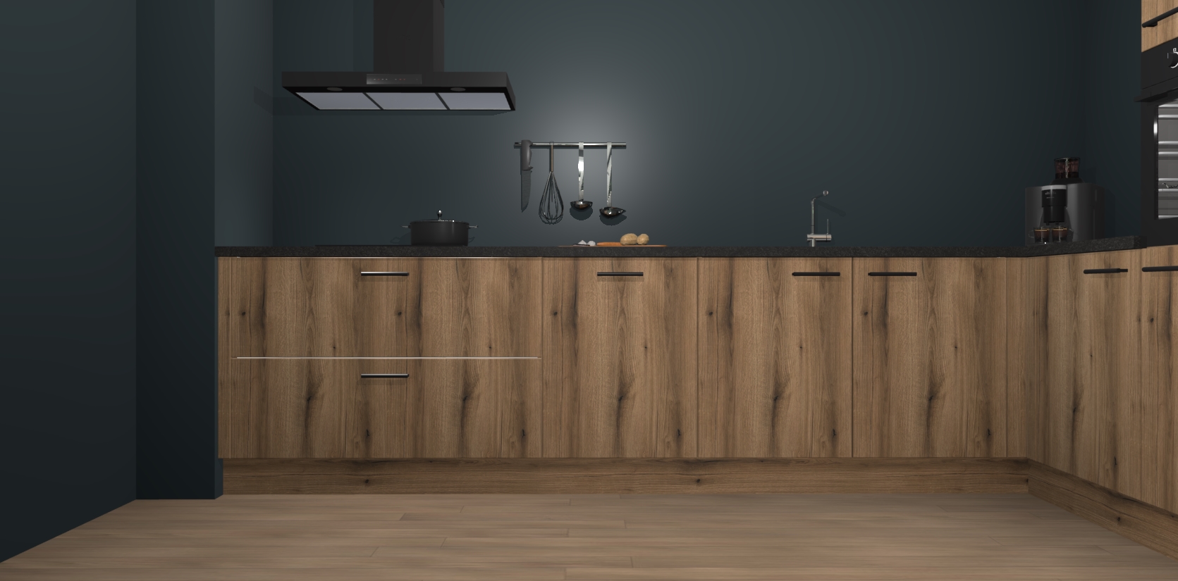 Welkom bij de Goud Eiken keuken Portland. Deze prachtige keuken zal de komende jaren het middelpunt van de belangstelling in uw huis zijn. Uitgerust met vijf inbouwapparaten komt u nooit kookgereedschap tekort. Bovendien geeft de warme houtlook elke ruimte een uitnodigende en tijdloze uitstraling.