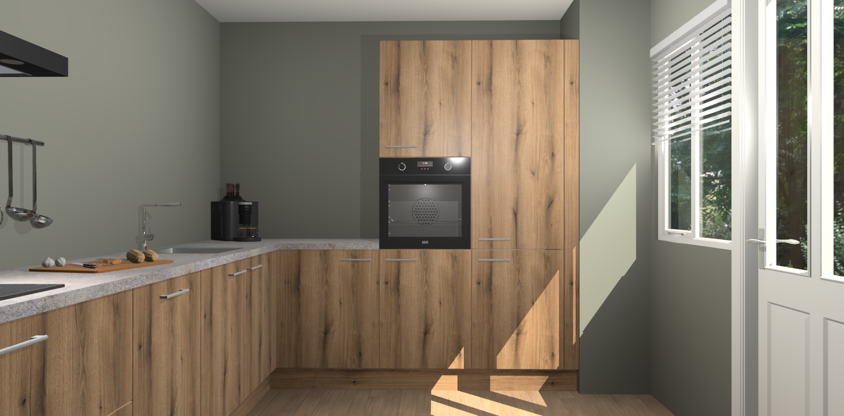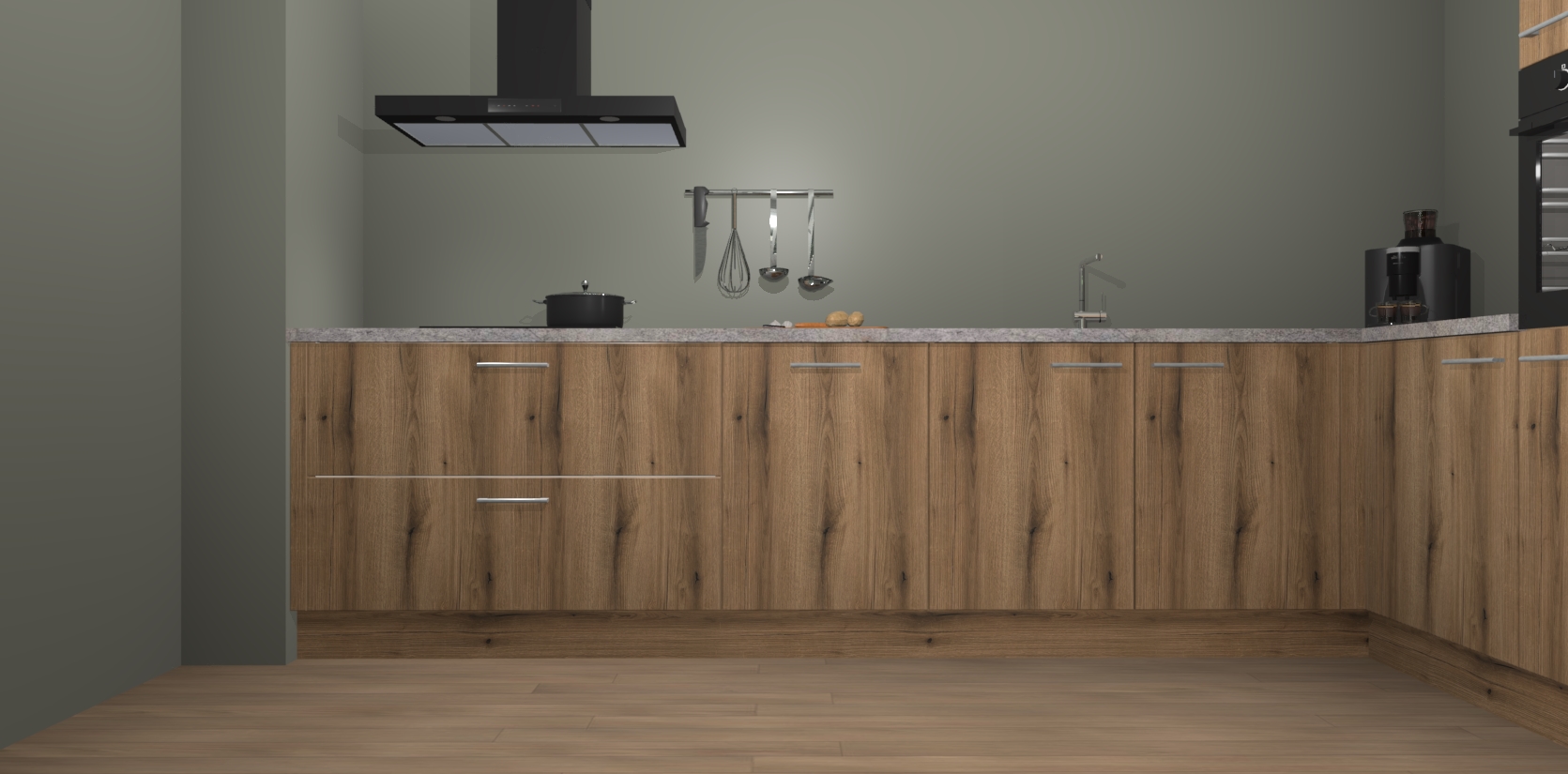 Welkom bij de Goud Eiken keuken Portland. Deze prachtige keuken zal de komende jaren het middelpunt van de belangstelling in uw huis zijn. Uitgerust met vijf inbouwapparaten komt u nooit kookgereedschap tekort. Bovendien geeft de warme houtlook elke ruimte een uitnodigende en tijdloze uitstraling.