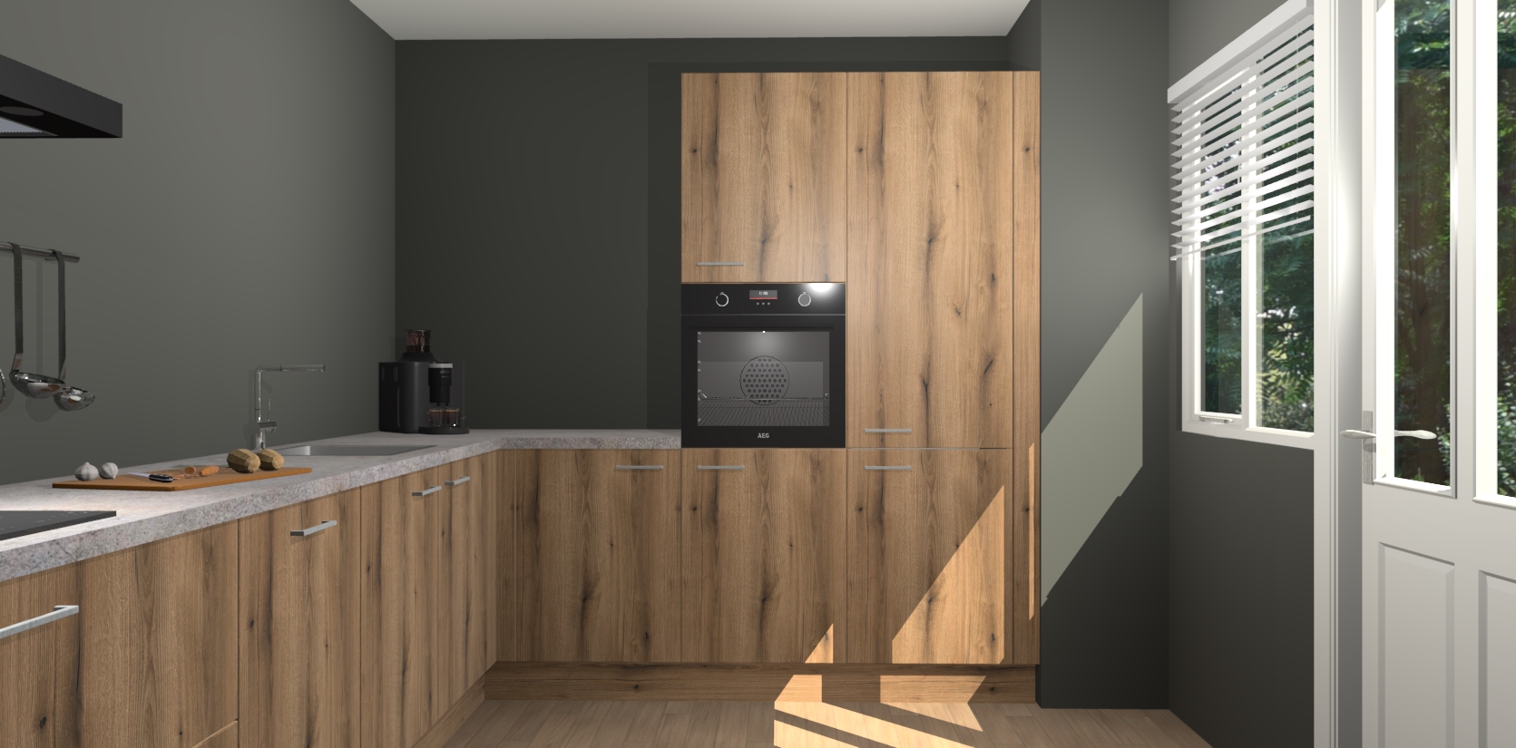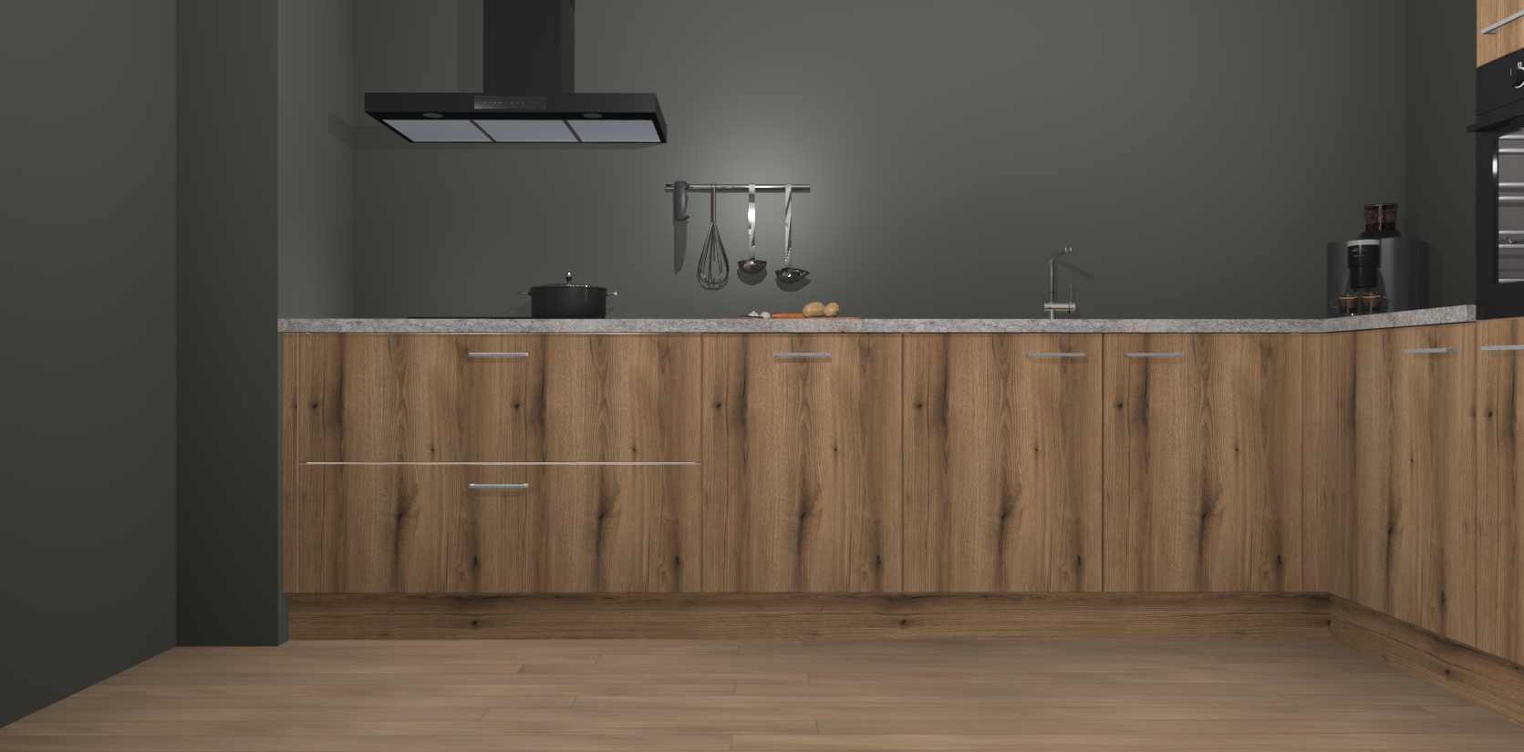 Welkom bij de Goud Eiken keuken Portland. Deze prachtige keuken zal de komende jaren het middelpunt van de belangstelling in uw huis zijn. Uitgerust met vijf inbouwapparaten komt u nooit kookgereedschap tekort. Bovendien geeft de warme houtlook elke ruimte een uitnodigende en tijdloze uitstraling.