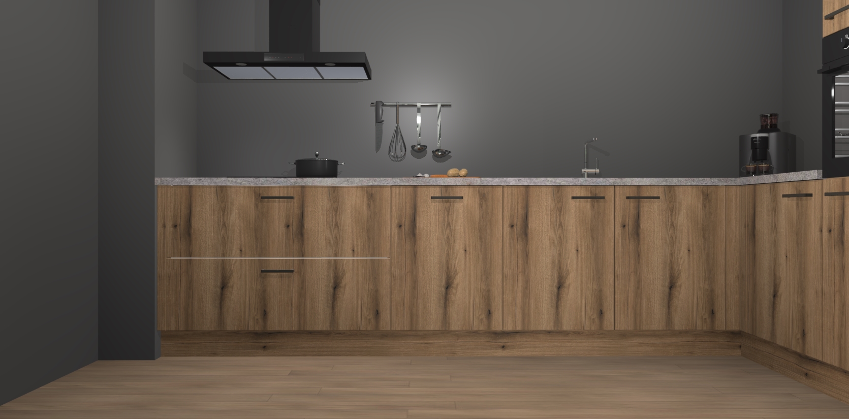 Welkom bij de Goud Eiken keuken Portland. Deze prachtige keuken zal de komende jaren het middelpunt van de belangstelling in uw huis zijn. Uitgerust met vijf inbouwapparaten komt u nooit kookgereedschap tekort. Bovendien geeft de warme houtlook elke ruimte een uitnodigende en tijdloze uitstraling.