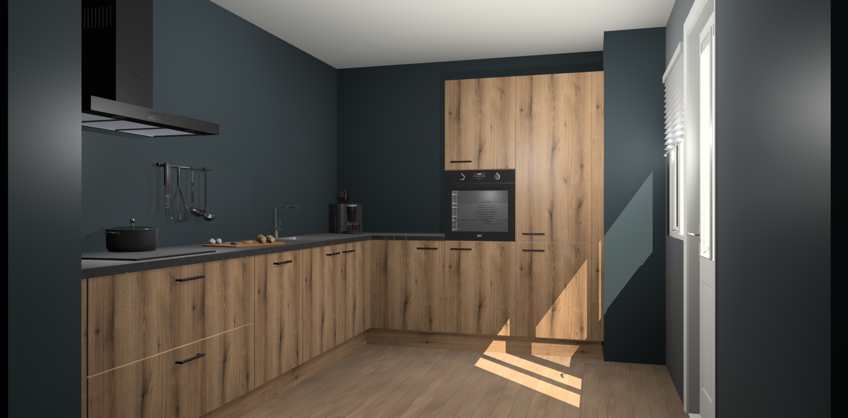 Welkom bij de Goud Eiken keuken Portland. Deze prachtige keuken zal de komende jaren het middelpunt van de belangstelling in uw huis zijn. Uitgerust met vijf inbouwapparaten komt u nooit kookgereedschap tekort. Bovendien geeft de warme houtlook elke ruimte een uitnodigende en tijdloze uitstraling.