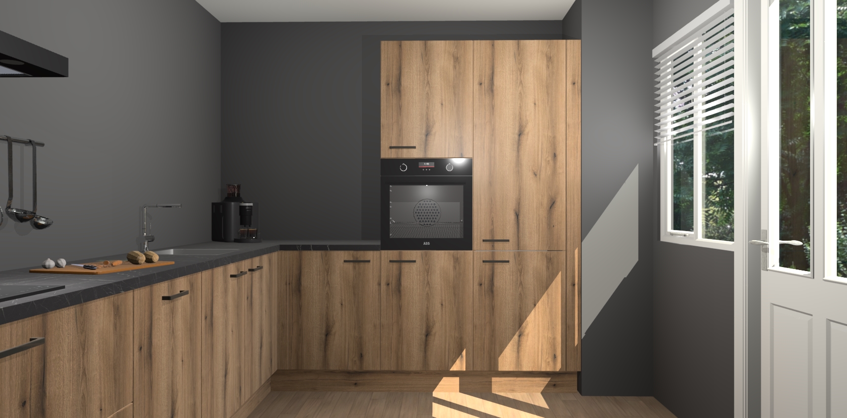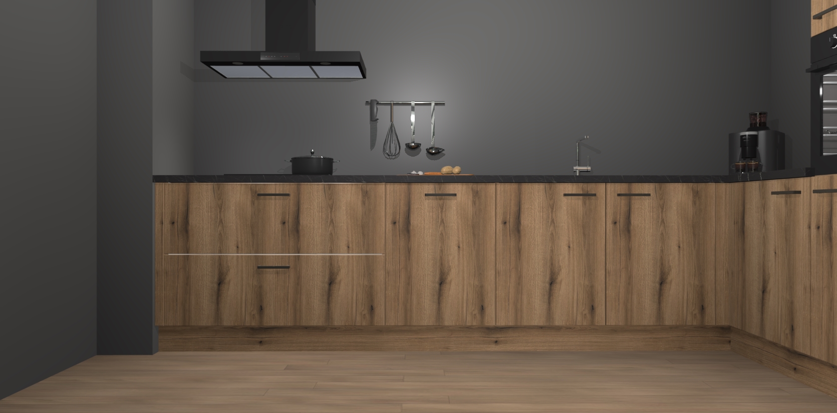 Welkom bij de Goud Eiken keuken Portland. Deze prachtige keuken zal de komende jaren het middelpunt van de belangstelling in uw huis zijn. Uitgerust met vijf inbouwapparaten komt u nooit kookgereedschap tekort. Bovendien geeft de warme houtlook elke ruimte een uitnodigende en tijdloze uitstraling.